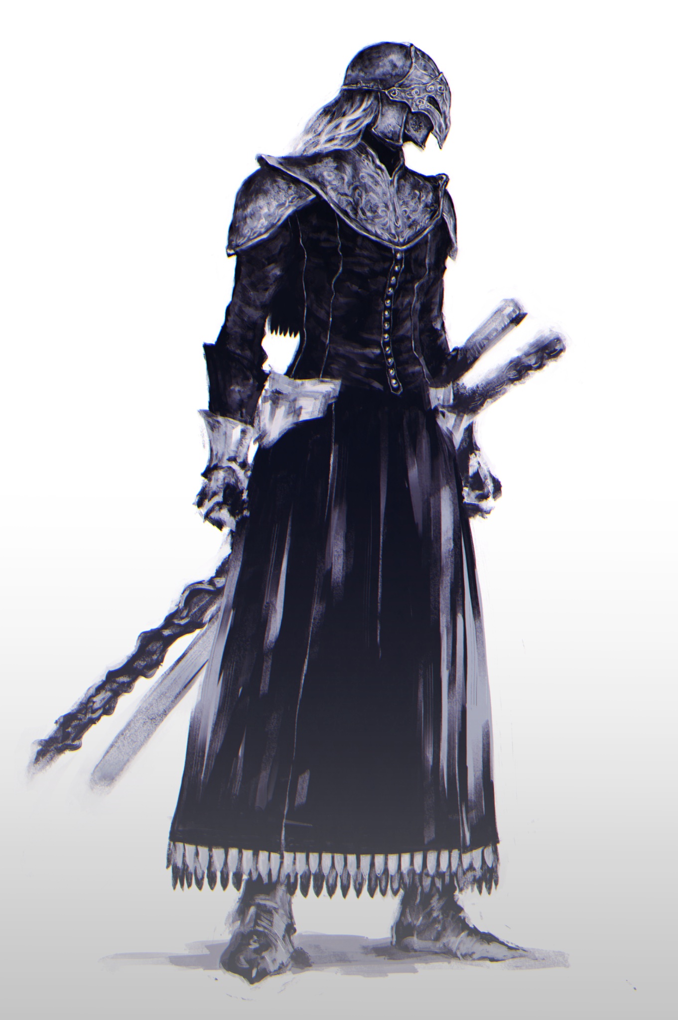 1girl armor armored_dress commentary_request covered_eyes covered_face dark_souls_(series) dark_souls_iii dress helm helmet highres hip_armor scabbard sheath shoulder_armor solo standing sword vbtem2rhxc2qchk weapon white_background white_hair yuria_of_londor