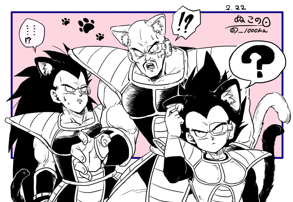 !? 3boys ? animal_ears armor bald cat_ears commentary dated dragon_ball dragonball_z english_commentary facial_hair frown greyscale_with_colored_background kemonomimi_mode long_hair male_focus monkey_tail multiple_boys mustache nappa open_mouth paw_print pink_background raditz saiyan_armor scouter senka-san shoulder_armor signature spoken_interrobang spoken_question_mark sweatdrop tail twitter_username vambraces vegeta very_long_hair widow's_peak