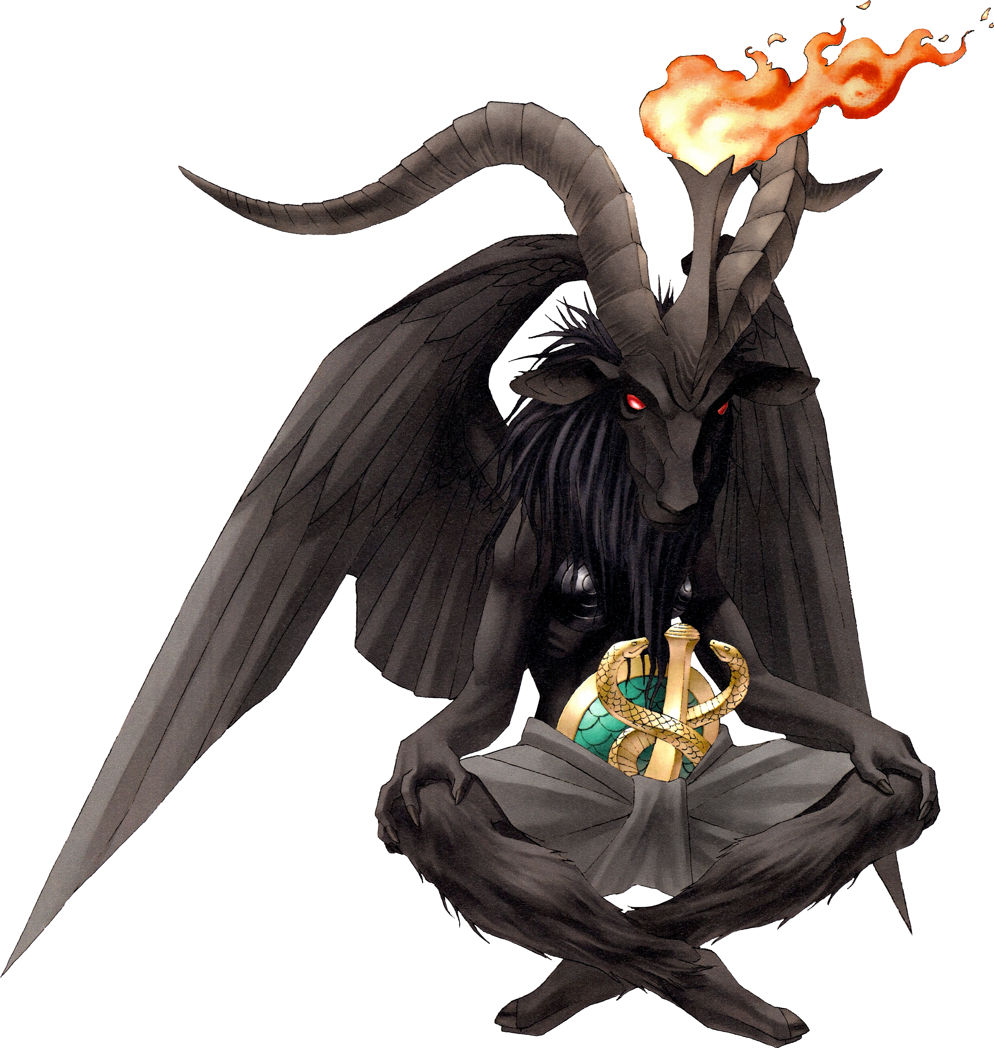 absurdres animal_ears baphomet_(megami_tensei) caduceus demon demon_(megami_tensei) feathered_wings fire full_body goat_ears goat_horns hands_on_own_knees highres hooves horns indian_style kazuma_kaneko official_art photoshop_(medium) red_eyes shin_megami_tensei shin_megami_tensei_iii:_nocturne simple_background sitting solo third-party_source transparent_background wings