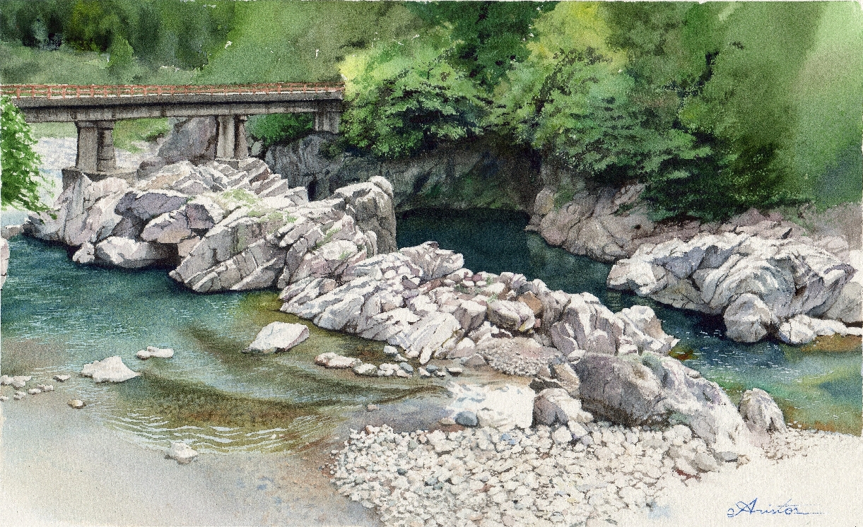 aris_0827 bridge commentary_request day forest landscape nature no_humans original outdoors painting_(medium) river rock scenery signature traditional_media water watercolor_(medium)