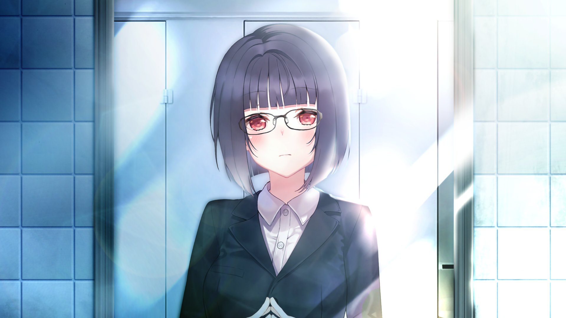 1girl bespectacled black_hair black_suit blunt_bangs blunt_ends blush collared_shirt commentary_request formal_clothes glasses hakuchuumu_no_aojashin highres looking_at_mirror medium_hair mirror momonouchi_sumomo official_art own_hands_together red_eyes reflection second-party_source shimofuri shirt solo suit upper_body white_shirt wig wing_collar