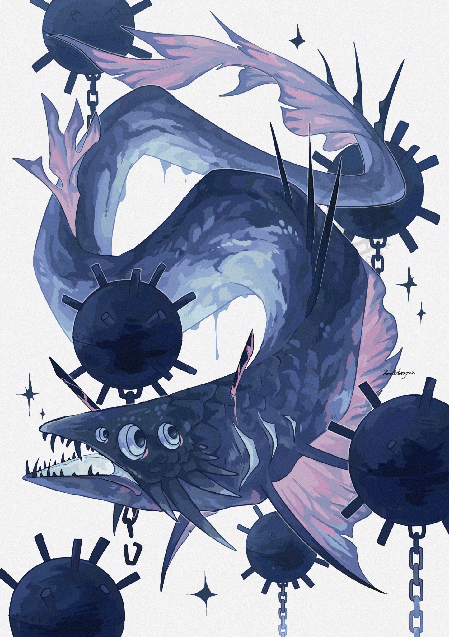 chain creature creature_focus crest explosive extra_eyes fish highres mine_(weapon) naval_mine open_mouth original ringed_eyes sharp_teeth teeth w_@komodo whiskers white_background