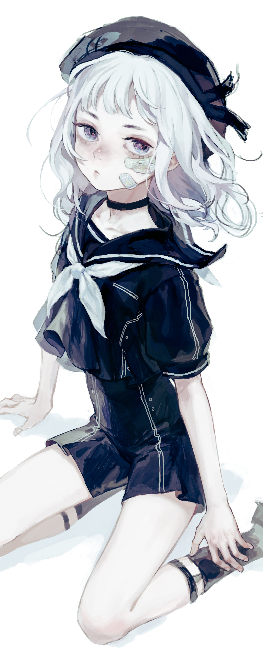 1girl absurdres bandaid bandaid_on_face choker commentary_request flat_chest hat highres kurashiki_touka looking_at_viewer medium_hair original pale_skin sailor sailor_collar sailor_hat shorts simple_background sitting solo white_background white_eyes white_hair