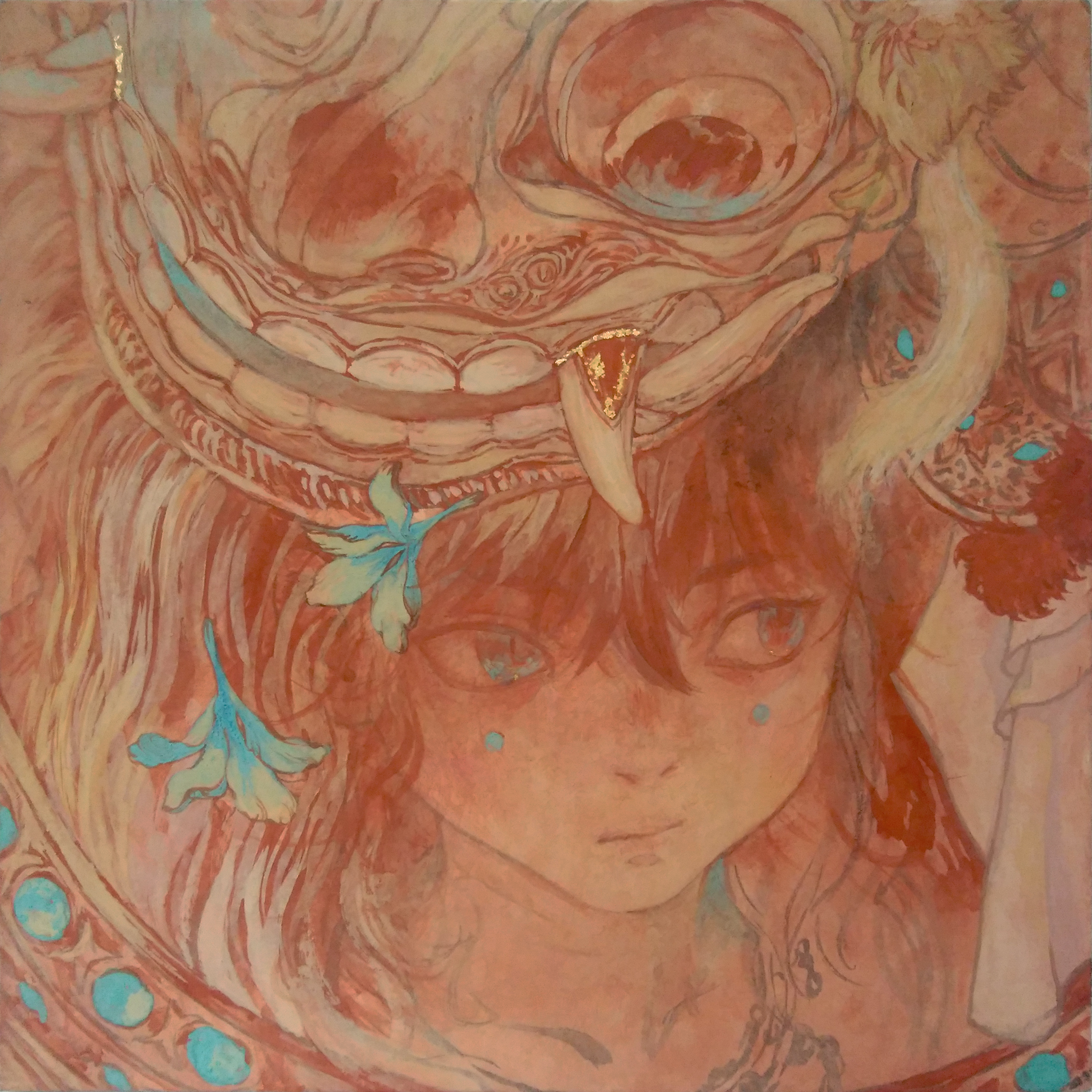 1girl absurdres blue_eyes close-up commentary_request facial_mark fangs flower grey_hair highres kurashiki_touka mask original solo teeth traditional_media
