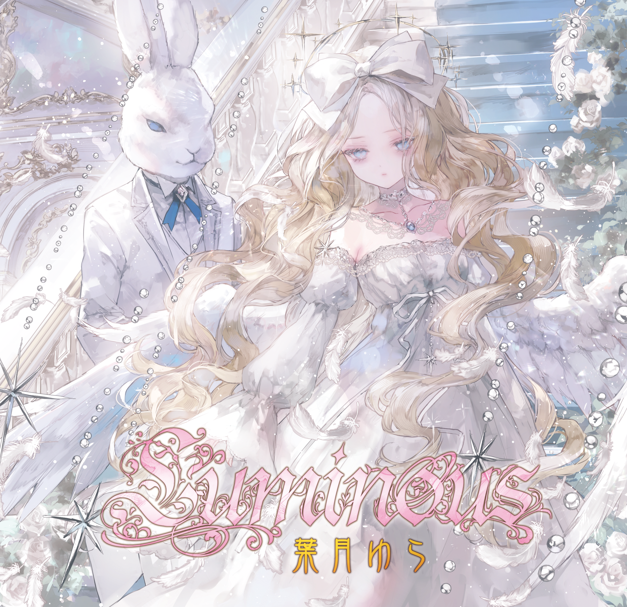 1boy 1girl album_cover album_name blonde_hair blue_eyes bow closed_mouth collarbone collared_shirt commentary_request cover detached_sleeves dress falling_feathers feathered_wings feathers furry furry_male hair_bow highres jacket long_hair looking_at_viewer original rabbit_boy second-party_source shirt stairs strapless strapless_dress suit_jacket tochigi_kirihito very_long_hair white_bow white_dress white_feathers white_jacket white_shirt white_wings wings
