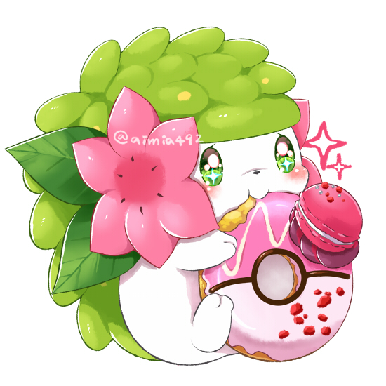 aimi_(aimia492) animal_focus blush commentary_request donut eating food gen_4_pokemon green_eyes legendary_pokemon macaron mythical_pokemon nintendo no_humans pokemon pokemon_(creature) shaymin shaymin_(land) simple_background smile solo star_(symbol) twitter_username white_background
