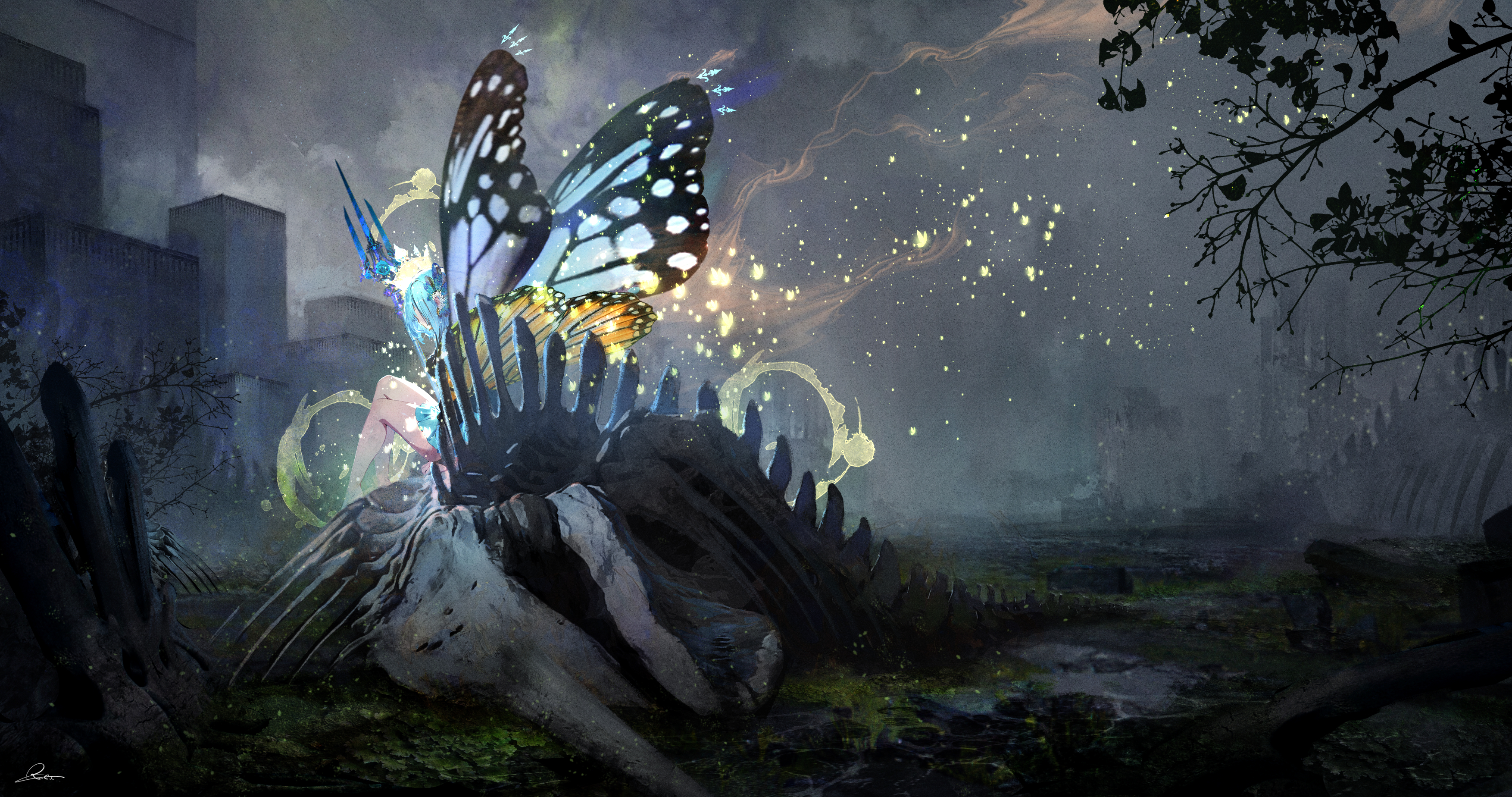 1girl absurdres black_shirt blue_hair blue_skirt breasts butterfly_wings crown fairy fantasy giant_skeleton highres insect_wings kurasuta miniskirt original outdoors overcast polearm scenery shirt sitting skirt sky trident weapon wide_shot wings