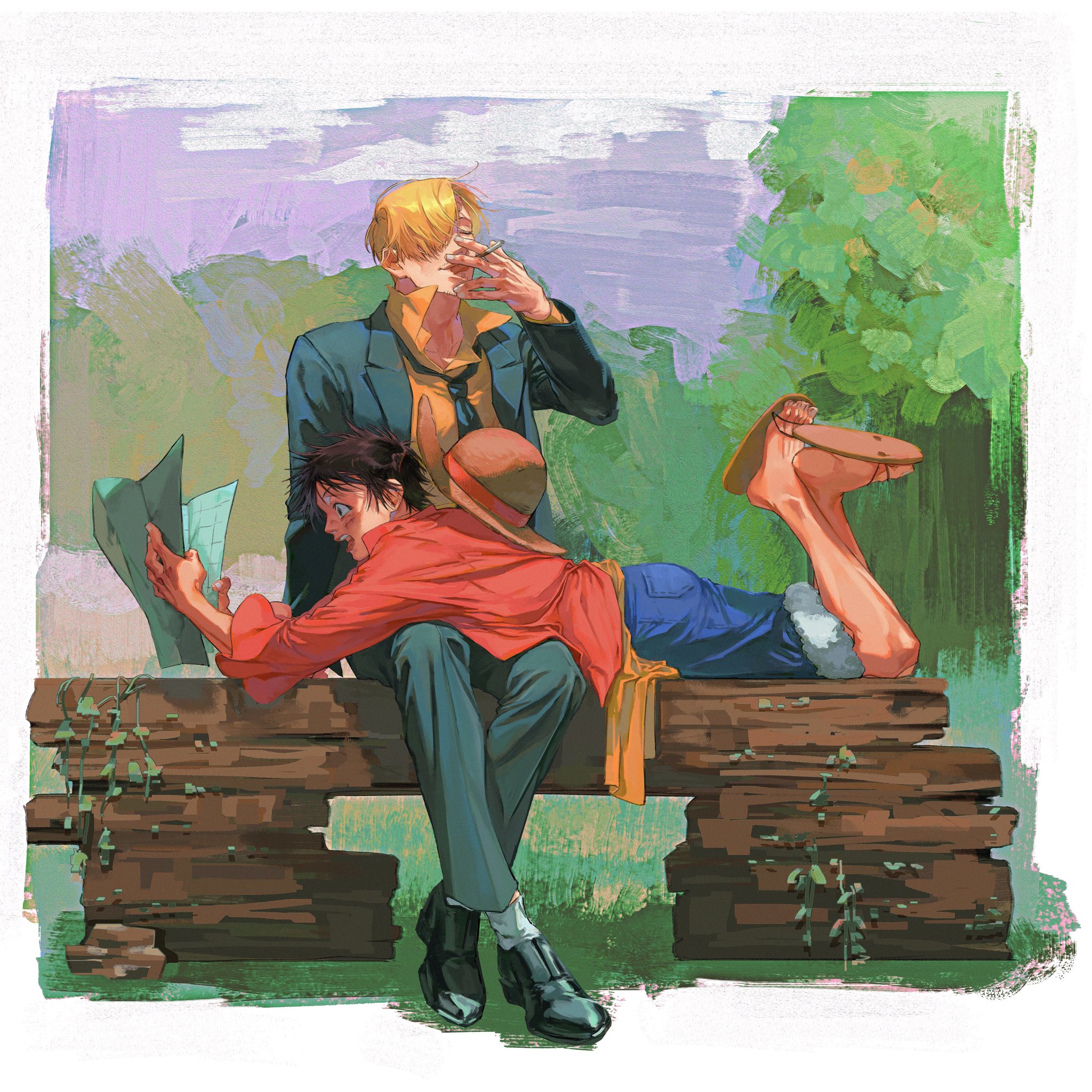 2boys cigarette curly_eyebrows facial_hair goatee hair_over_one_eye hat highres male_focus monkey_d._luffy multiple_boys mustache_stubble one_piece row056 sanji_(one_piece) smoking straw_hat stubble