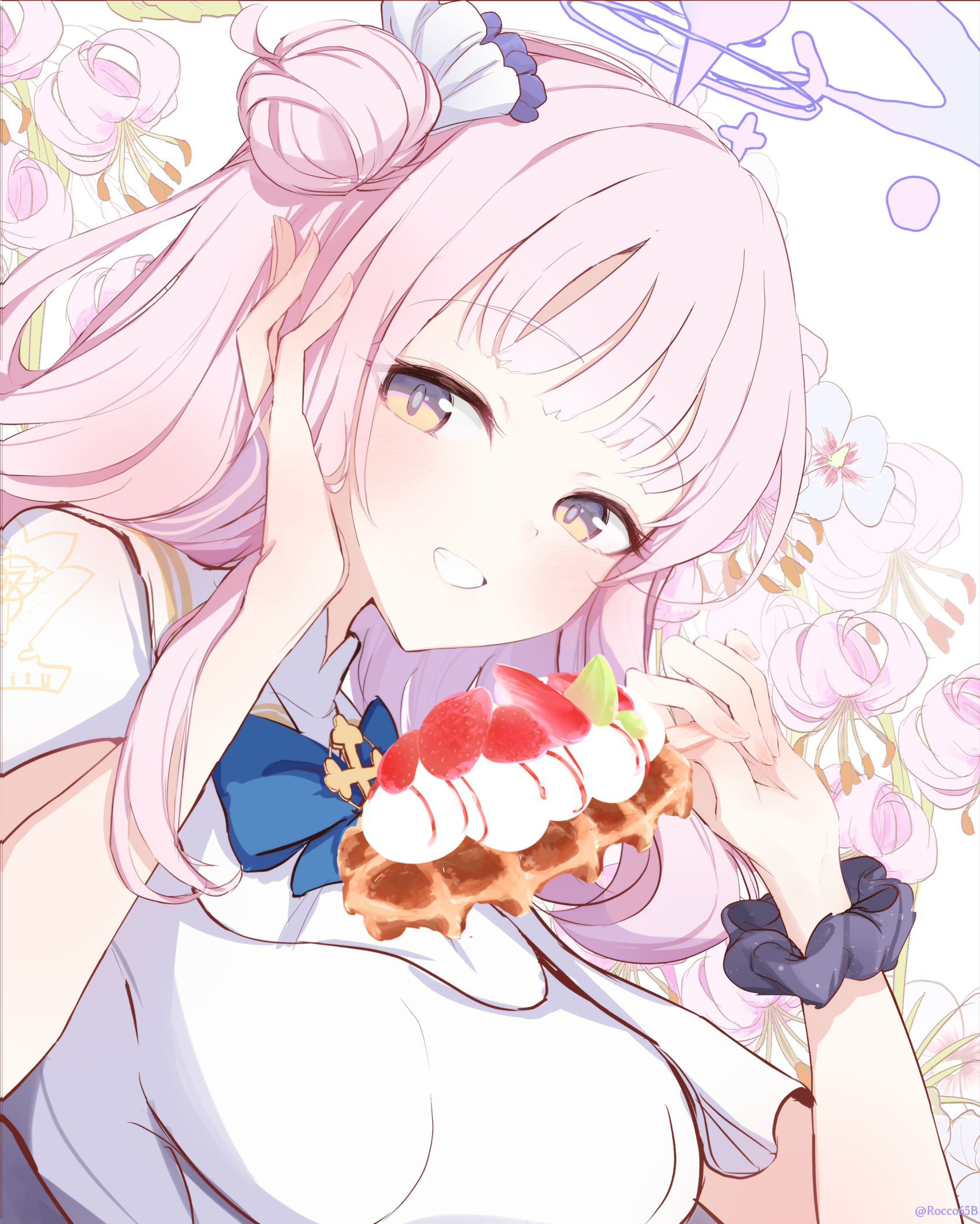 1girl black_scrunchie blue_archive blue_bow bow breasts capelet commentary_request dress flower food gold_trim hair_bun hand_on_own_cheek hand_on_own_face highres looking_at_viewer medium_breasts mika_(blue_archive) pink_flower pink_hair purple_eyes sakurano_rocco scrunchie single_hair_bun single_side_bun smile solo sweets teeth upper_body white_capelet white_dress wrist_scrunchie