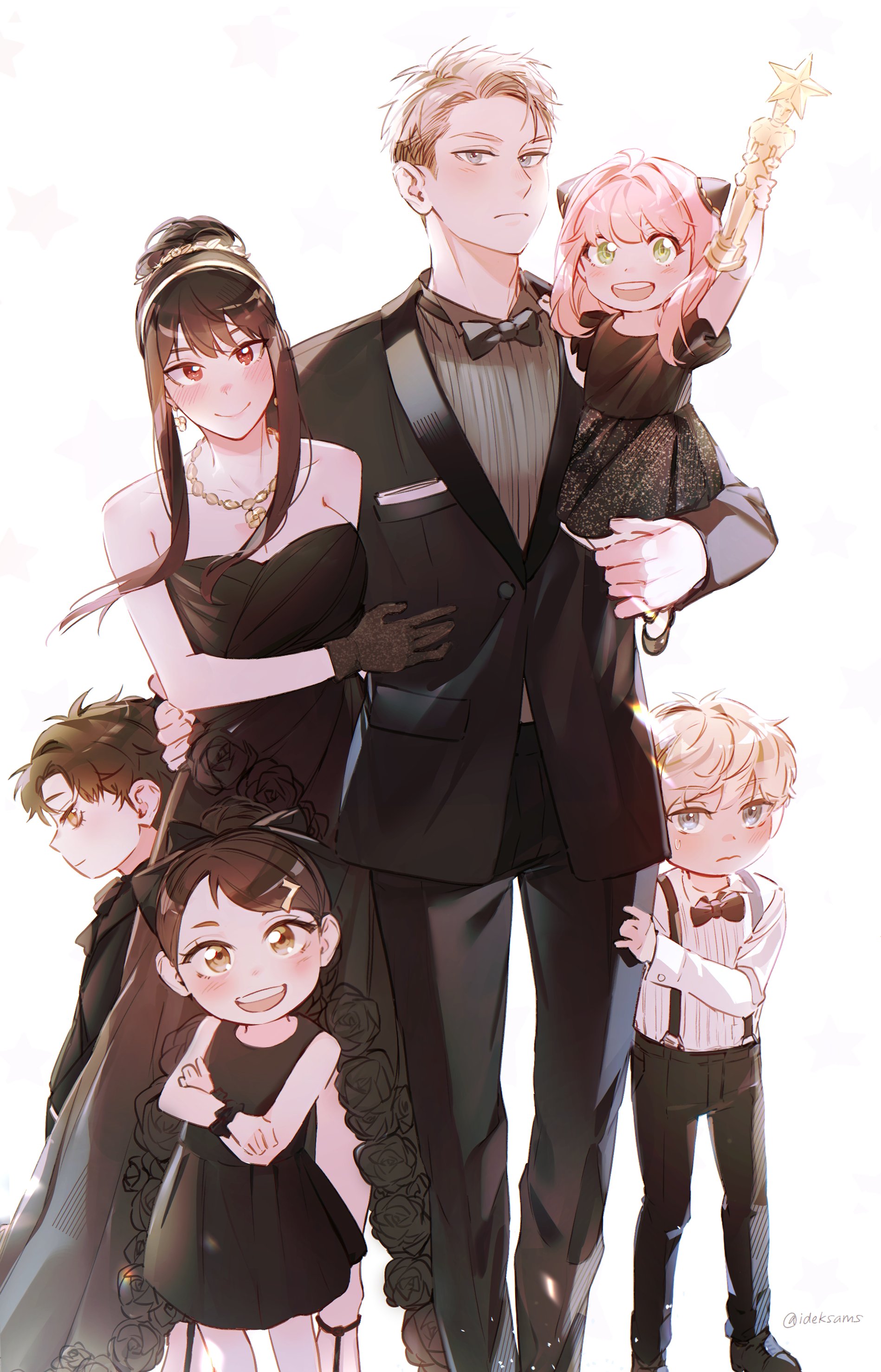 3boys 3girls absurdres anya_(spy_x_family) arm_around_waist bare_shoulders becky_blackbell black_bow black_bowtie black_dress black_hair black_jacket black_pants black_ribbon black_shoes black_suit blonde_hair blue_eyes blush bow bowtie breasts brown_eyes center_opening child cleavage collared_shirt commentary crossed_arms damian_desmond dress earrings feet_out_of_frame formal_clothes gold_earrings gold_necklace green_eyes grey_shirt hair_between_eyes hair_bun hair_ornament hair_ribbon hairclip hairpods highres husband_and_wife ideksams jacket jewelry large_breasts light_frown long_dress long_hair medium_hair multiple_boys multiple_girls necklace open_mouth pants pink_hair red_eyes ribbon scrunchie shirt shoes short_hair short_sleeves sidelocks sleeveless sleeveless_dress smile spy_x_family strapless strapless_dress suit suit_jacket swept_bangs symbol-only_commentary twilight_(spy_x_family) twitter_username updo white_background white_shirt wrist_scrunchie yor_briar
