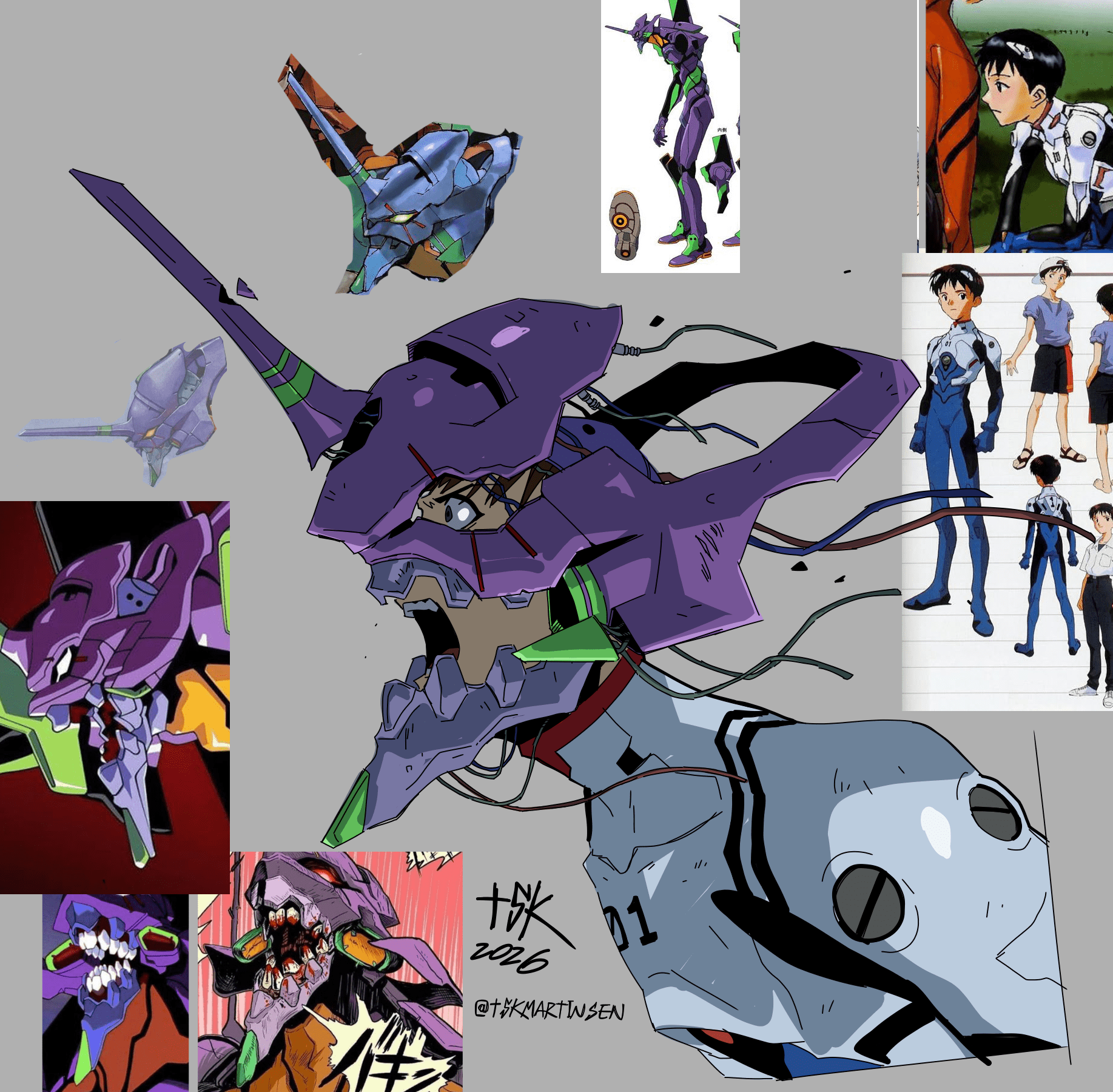 1boy 2026 cable commentary english_commentary eva_01 grey_background helmet highres ikari_shinji mecha mecha_pilot_suit neon_genesis_evangelion open_mouth plugsuit_(evangelion) robot science_fiction simple_background teeth tskmartinsen