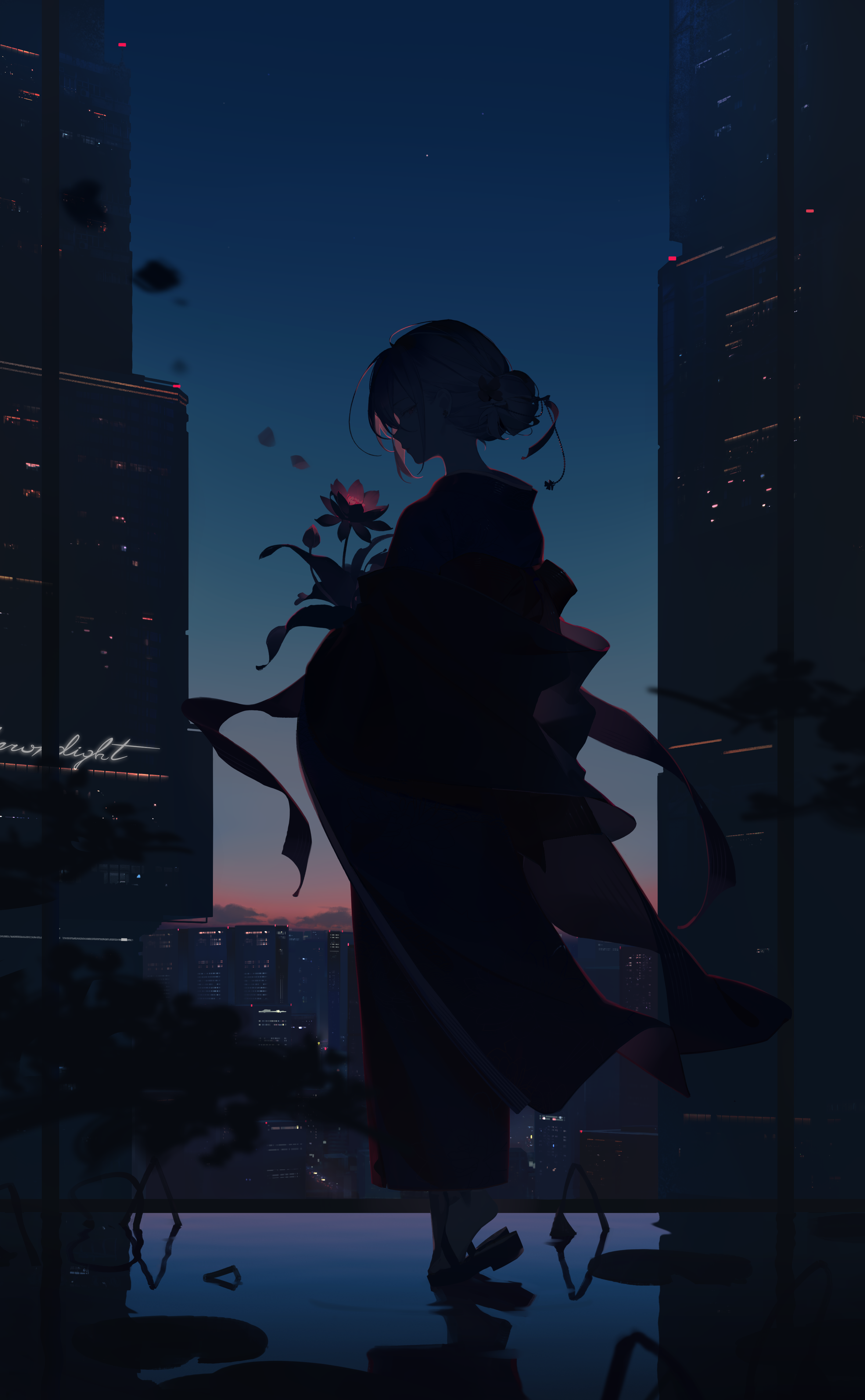 1girl a479098236 absurdres black_flower black_sandals blue_sky building closed_mouth cloud commentary dark flower hair_between_eyes hair_bun highres japanese_clothes kimono original outdoors profile purple_eyes purple_hair red_kimono reflection ripples sandals sky skyscraper solo sunrise symbol-only_commentary tiptoes water