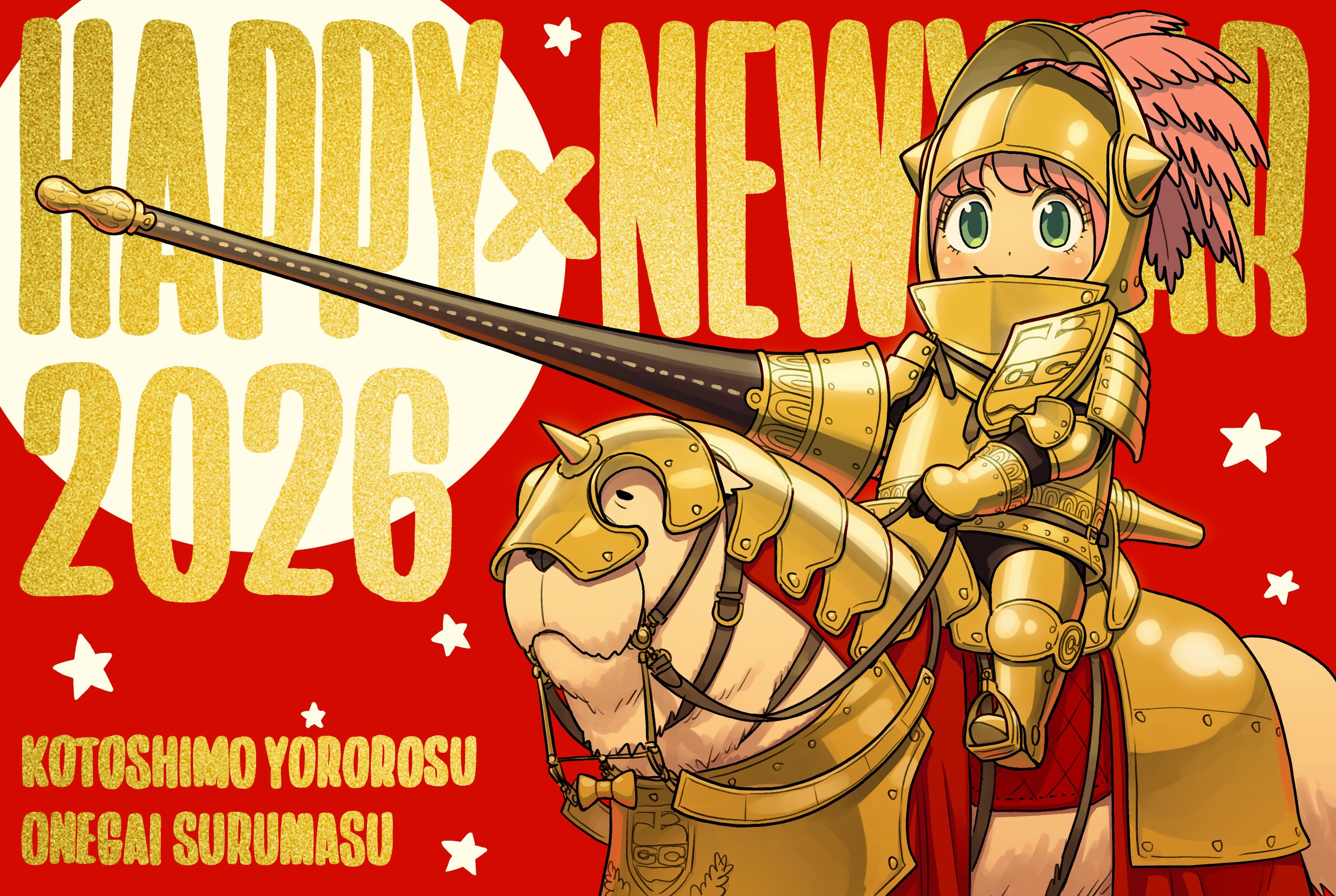 1girl 2026 alternate_costume anya_(spy_x_family) armor bond_(spy_x_family) child commentary_request dog endou_tatsuya english_text full_armor gauntlets great_pyrenees happy_new_year helm helmet highres holding holding_polearm holding_weapon knight lance medieval new_year official_art pauldrons plate_armor polearm shoulder_armor smile spy_x_family weapon white_dog