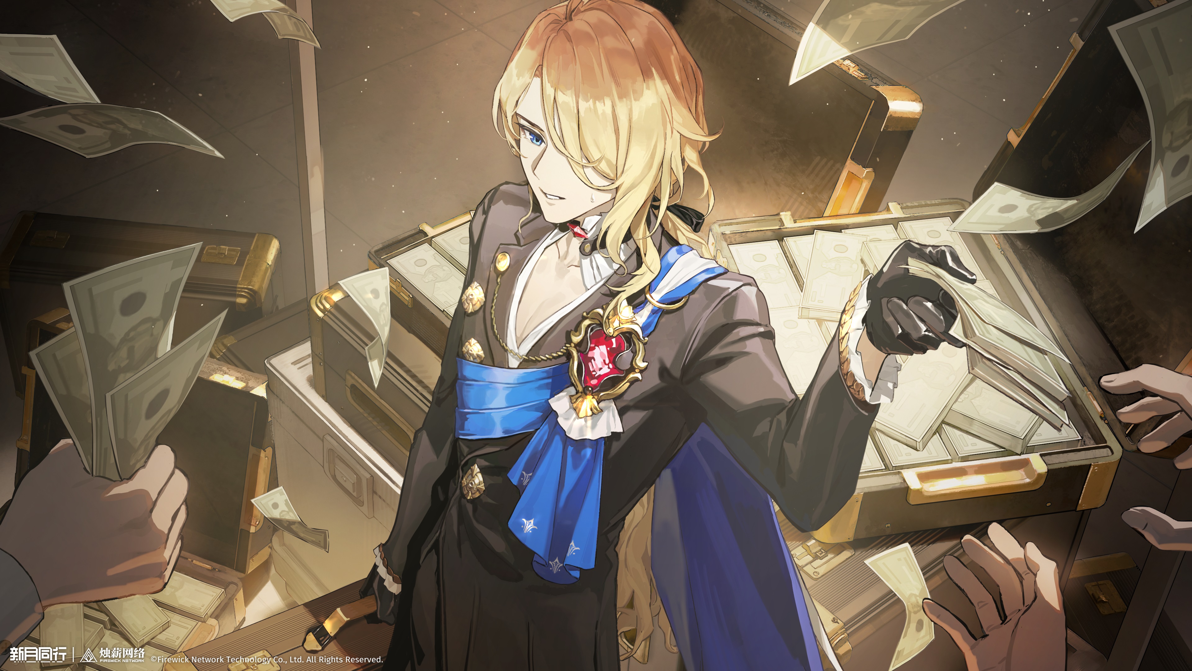 1boy absurdres banknote black_gloves black_jacket blonde_hair blue_cape blue_eyes cape copyright_name copyright_notice from_above giving gloves grin hair_over_one_eye hand_up heizu_(xinyue_tongxing) highres holding holding_money holding_suitcase jacket logo long_hair male_focus money official_art official_wallpaper one_eye_covered open_suitcase smile solo_focus suitcase sweat too_many_banknotes upper_body xinyue_tongxing