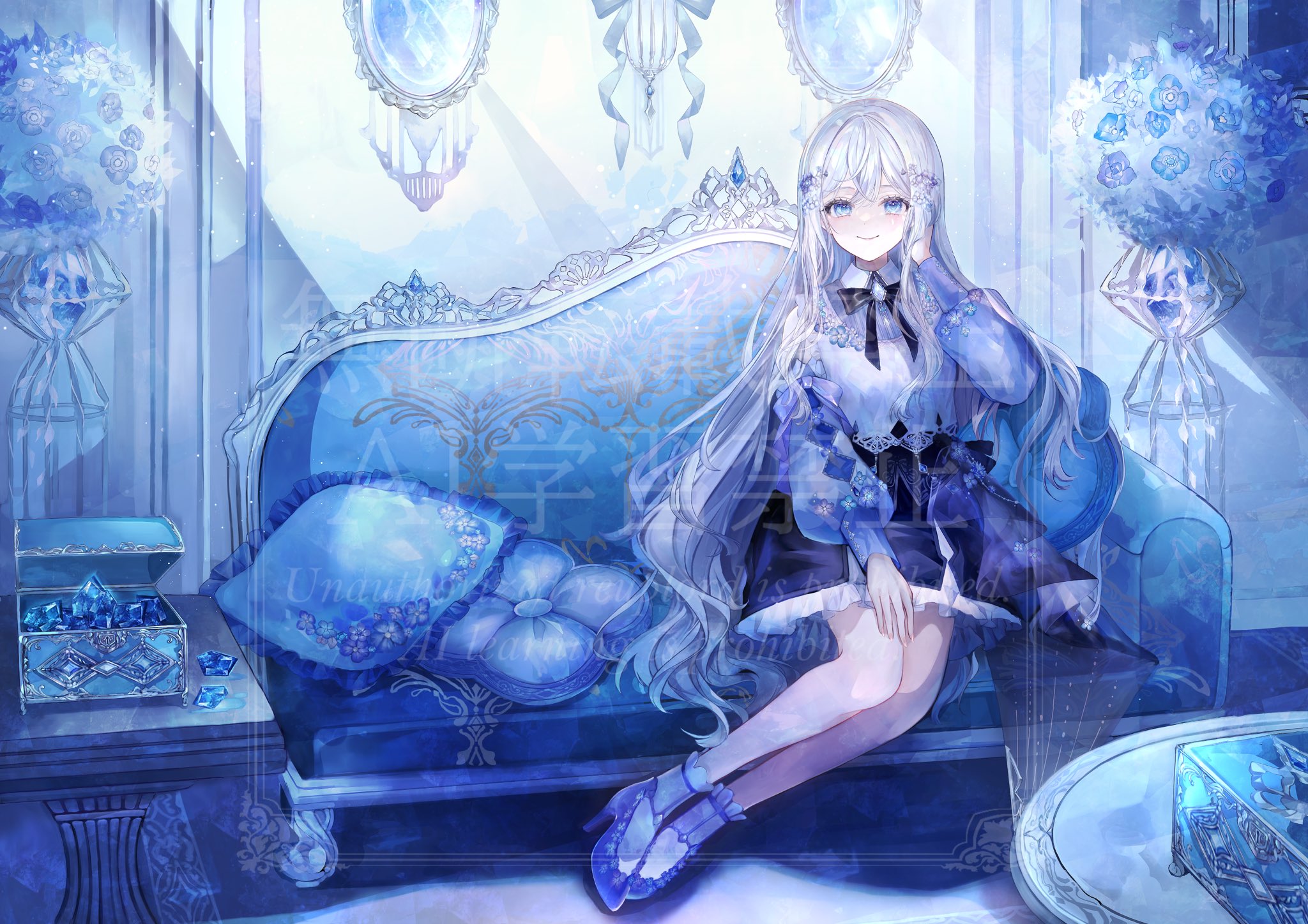 1girl black_ribbon black_skirt blue_eyes blue_flower blue_gem blue_shirt blue_shoes blue_sleeves blue_theme box brooch collared_shirt commentary_request commission couch detached_sleeves flower gem hair_ornament high_heels highres indie_virtual_youtuber jewelry long_hair looking_at_viewer mirror neck_ribbon on_couch pillow ribbon second-party_source seisaiminty shirt shoes sitting skirt smile solo virtual_youtuber watermark white_hair
