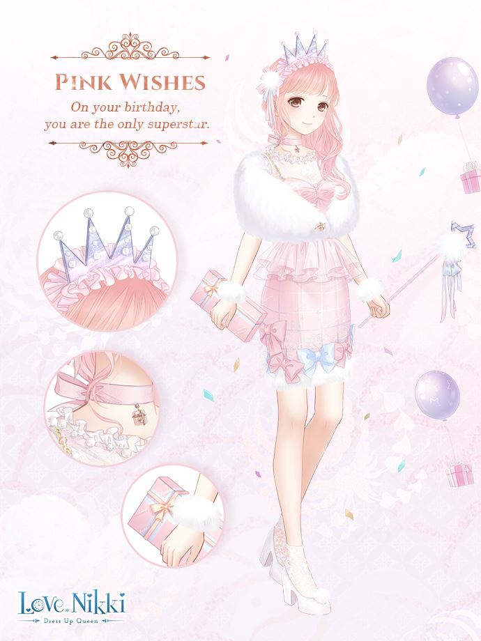 1girl artist_request balloon birthday blue_bow bow bow_choker character_name choker close-up confetti copyright_logo dress dress_bow english_text frilled_dress frilled_headwear frills full_body fur-trimmed_dress fur_shawl fur_trim fur_wrist_cuffs gift hair_over_shoulder happy high_heels holding holding_gift holding_wand jewelry knees lace_socks logo long_hair medium_dress miracle_nikki necklace nikki_(series) official_art pink_background pink_bow pink_choker pink_dress pink_hair pink_wishes_(miracle_nikki) plaid_clothes plaid_dress pom_pom_(clothes) pumps shawl shoes sleeveless sleeveless_dress socks solo standing star_wand third-party_source tiara wand wavy_hair white_shawl white_shoes white_socks white_wrist_cuffs wrist_cuffs