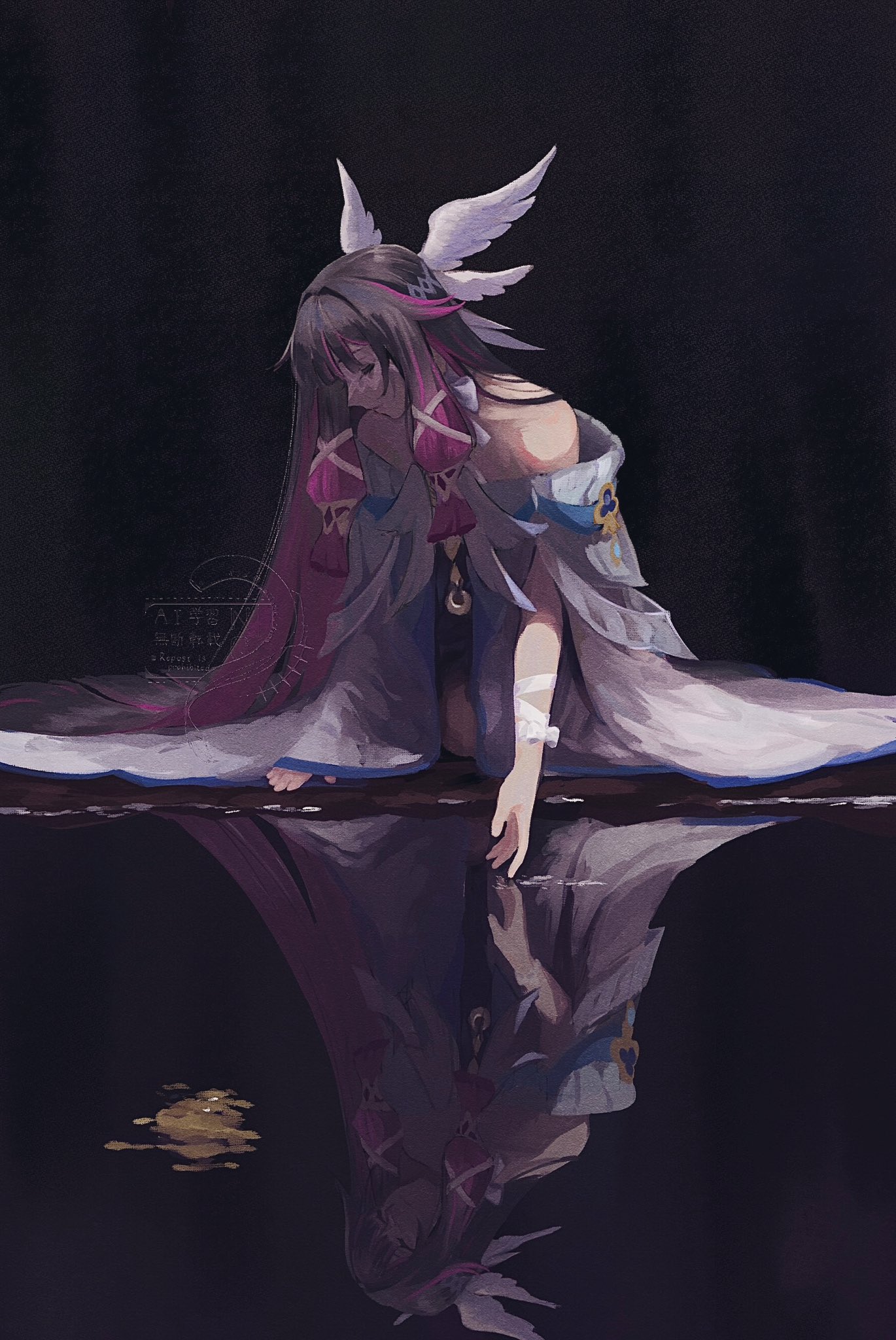 1girl bare_shoulders black_hair closed_eyes closed_mouth columbina_(genshin_impact) commentary_request dark_background different_reflection dress eye_mask genshin_impact hair_ribbon head_wings highres long_hair lz1f_ds3 mask multicolored_hair pink_hair reflection reflective_liquid ribbon two-tone_hair very_long_hair watermark white_dress white_ribbon white_wings wings