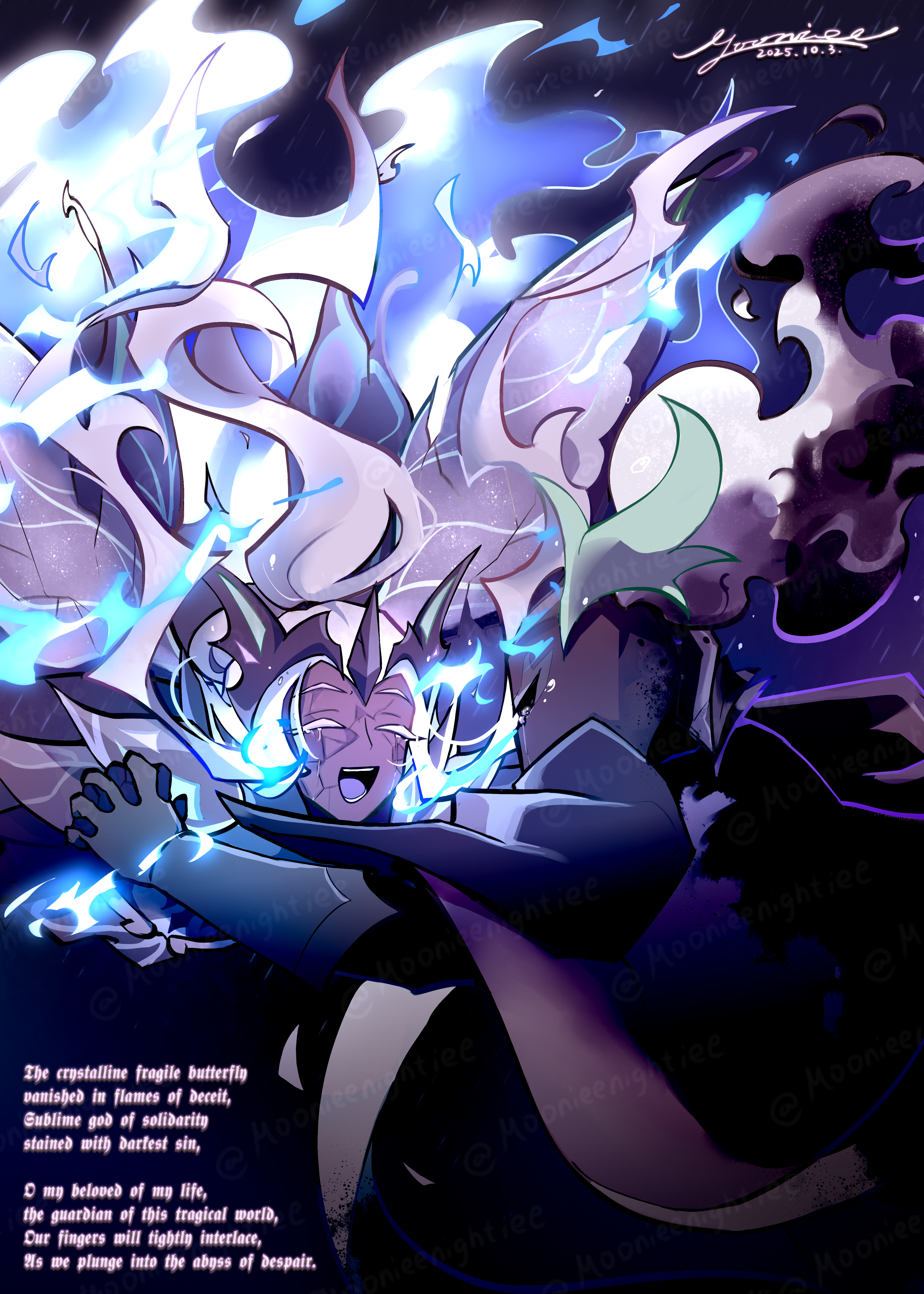2boys :d ^_^ absurdres armor black_armor black_cape black_gloves blue_fire burning butterfly_wings cape chinese_commentary closed_eyes colored_eyelashes colored_tongue commentary_request cookie_run cookie_run:_kingdom covered_face cracked_skin crown crying dark-skinned_male dark_skin death elder_faerie_cookie english_text facing_another fire floating_hair full_armor gloves grey_hair helm helmet high_ponytail highres holding_hands insect_wings interlocked_fingers long_hair long_sleeves male_focus moonieenightiee multiple_boys open_mouth parted_bangs pauldrons ponytail purple_tongue rain shoulder_armor signature silent_salt_cookie smile spoilers teeth upper_body very_long_hair watermark white_eyelashes wings yaoi