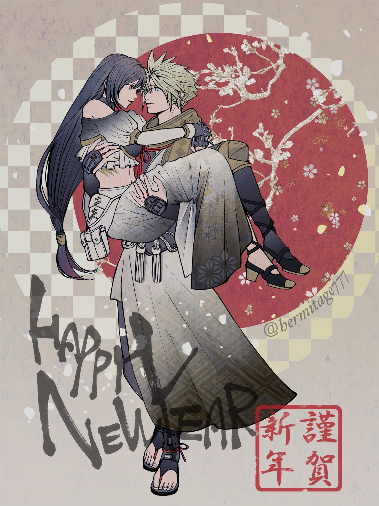 1boy 1girl arms_around_neck bare_shoulders black_gloves black_hair blonde_hair blue_eyes carrying cloud_strife cloud_strife_(official_festive_garb) commentary_request couple cropped_shirt face-to-face falling_petals final_fantasy final_fantasy_vii final_fantasy_vii:_ever_crisis fingerless_gloves floral_background floral_print floral_print_skirt frilled_shirt frills full_body gloves ha_lu77 happy_new_year hetero high_heels highres japanese_clothes kimono knee_pads long_hair long_skirt looking_at_another looking_at_viewer low-tied_long_hair midriff new_year off-shoulder_shirt off_shoulder official_alternate_costume parted_lips petals princess_carry print_skirt red_eyes sandals scarf shirt short_hair signature single_knee_pad skirt smile spiked_hair standing tifa_lockhart tifa_lockhart_(golden_flower_kimono) twitter_username
