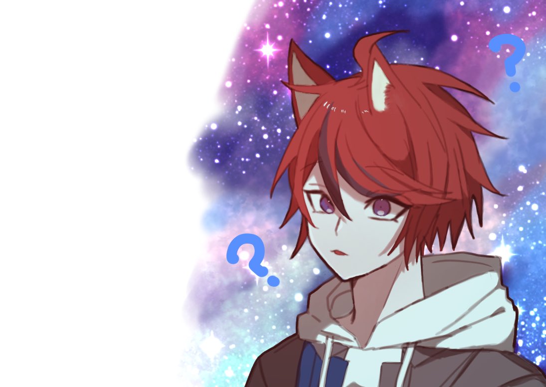 1boy ? ahoge alternate_eye_color animal_ear_fluff animal_ears black_hair cat_ears commentary_request drawstring grey_jacket hair_between_eyes hood hood_down hoodie jacket jacket_over_hoodie male_focus meme multicolored_hair oniku_(3_tg_a) open_clothes open_jacket open_mouth portrait purple_eyes red_hair short_hair solo space space_cat_(meme) streaked_hair sumino_takumi the_hundred_line_-last_defense_academy- two-tone_hair white_hoodie