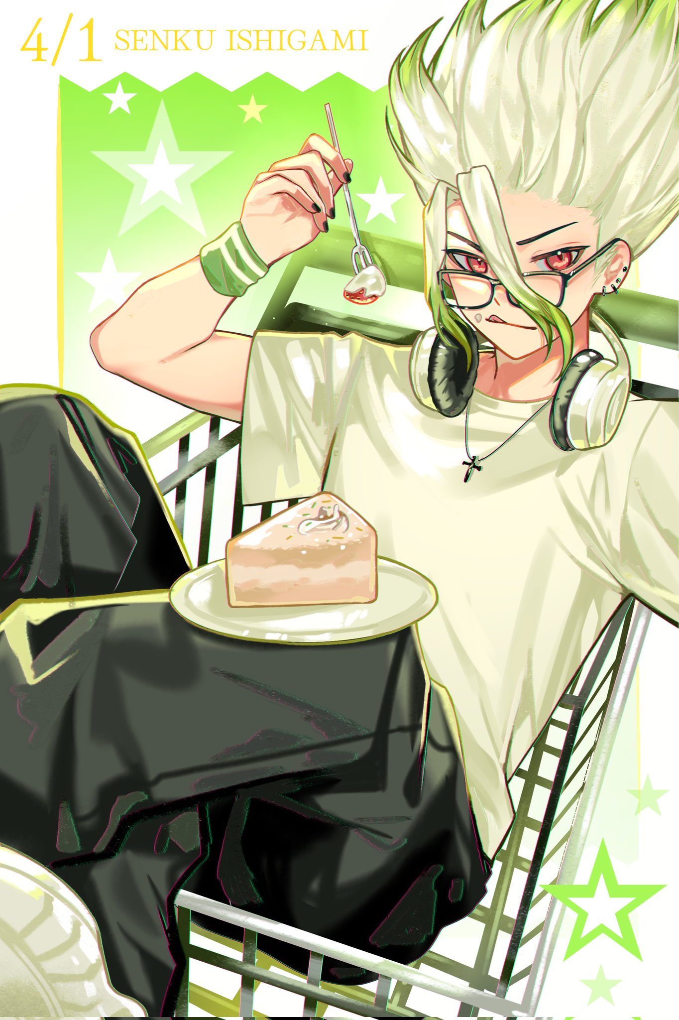 1boy alternate_costume black_nails black_pants cake cake_slice cross cross_necklace dated dr._stone food fork glasses gradient_hair green_hair happy_birthday hashtag-only_commentary headphones headphones_around_neck highres holding holding_fork ishigami_senkuu jewelry looking_at_viewer male_focus multicolored_hair necklace noinolphs pants red_eyes shirt sitting solo spiked_hair strawberry_shortcake