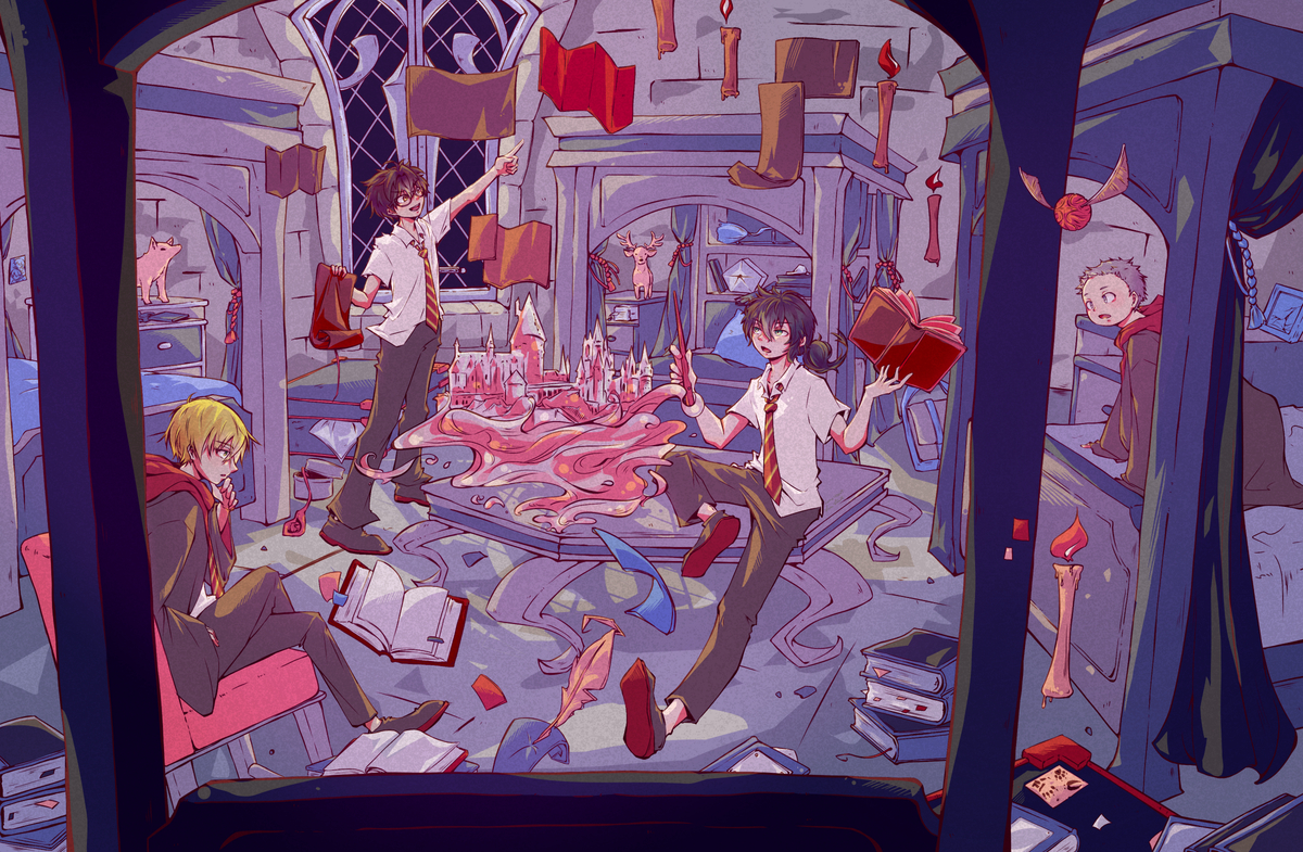 4boys bed black_hair blonde_hair book brown_hair candle castle collar curtains floating floating_hair floating_object full_body glasses grey_hair gryffindor hand_on_own_chin harry_potter_(series) hogwarts hogwarts_school_uniform holding holding_book holding_paper james_potter long_hair looking_at_object lunaheart male_focus marauders_map multiple_boys necktie open_mouth paper peter_pettigrew pillow ponytail profile quill remus_lupin school_uniform shirt shoes short_hair sirius_black sitting standing white_shirt window wing_collar wings wizarding_world