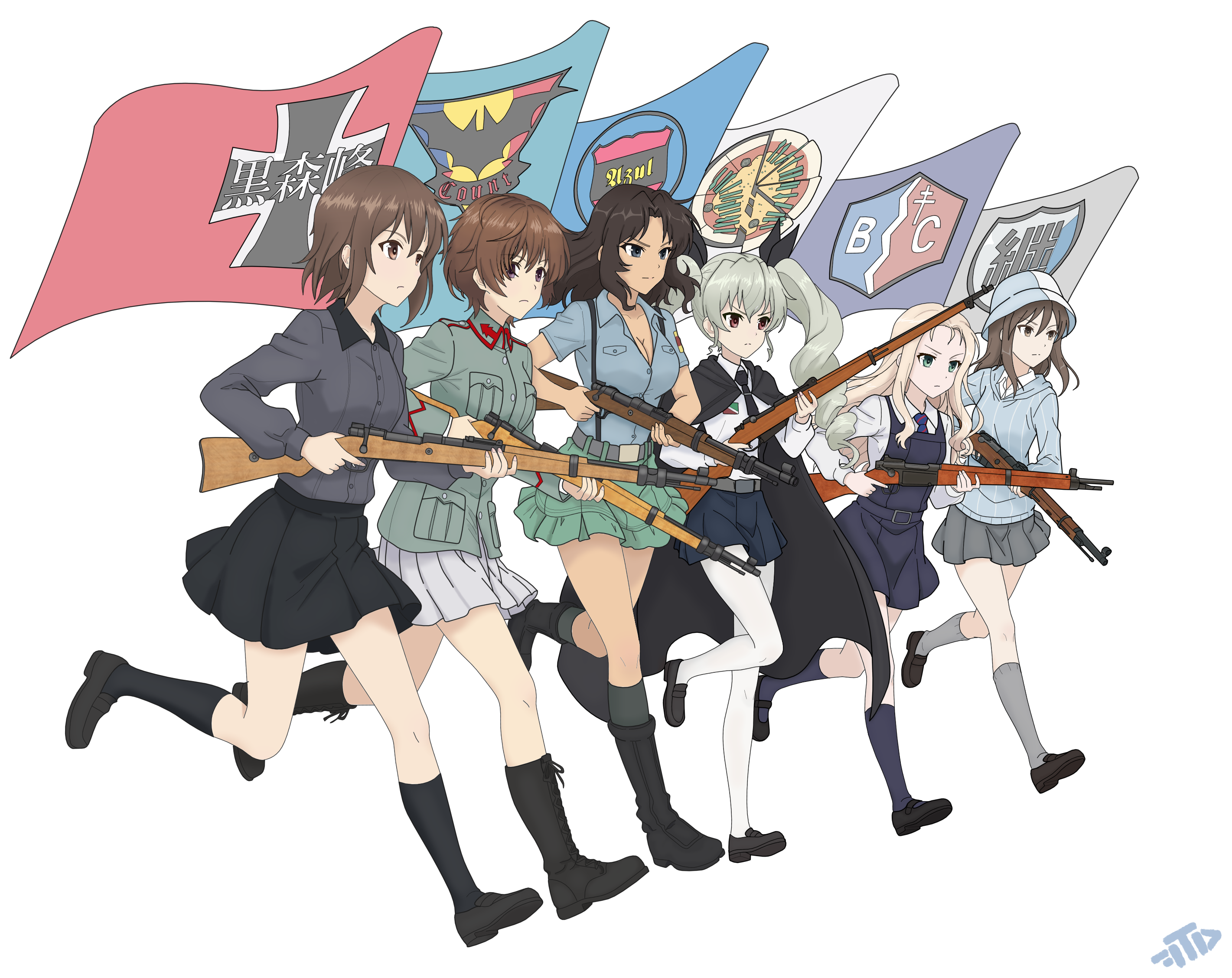 6+girls anchovy_(girls_und_panzer) anzio_(emblem) anzio_school_uniform aoshidan_(emblem) aoshidan_school_uniform bc_freedom_(emblem) bc_freedom_school_uniform black_cape black_hair black_necktie black_shirt black_shoes black_skirt black_socks black_sweater blonde_hair blue_eyes blue_hat blue_shirt brown_hair cape character_request commentary count_(emblem) count_military_uniform dark-skinned_female dark_skin dress el_(girls_und_panzer) emblem english_commentary flag full_body girls_und_panzer grey_hair grey_shirt grey_skirt grey_socks gun hat highres holding holding_flag holding_gun holding_weapon keizoku_(emblem) keizoku_school_uniform kohiyama_noemi kuromorimine_(emblem) kuromorimine_school_uniform long_hair long_sleeves marie_(girls_und_panzer) mika_(girls_und_panzer) multiple_girls necktie nishizumi_maho pantyhose pinafore_dress red_eyes rifle running school_uniform shirt shoes short_hair simple_background skirt sleeveless sleeveless_dress socks standing sweater thedaniilfox tulip_hat walking weapon weapon_request white_background white_pantyhose white_skirt
