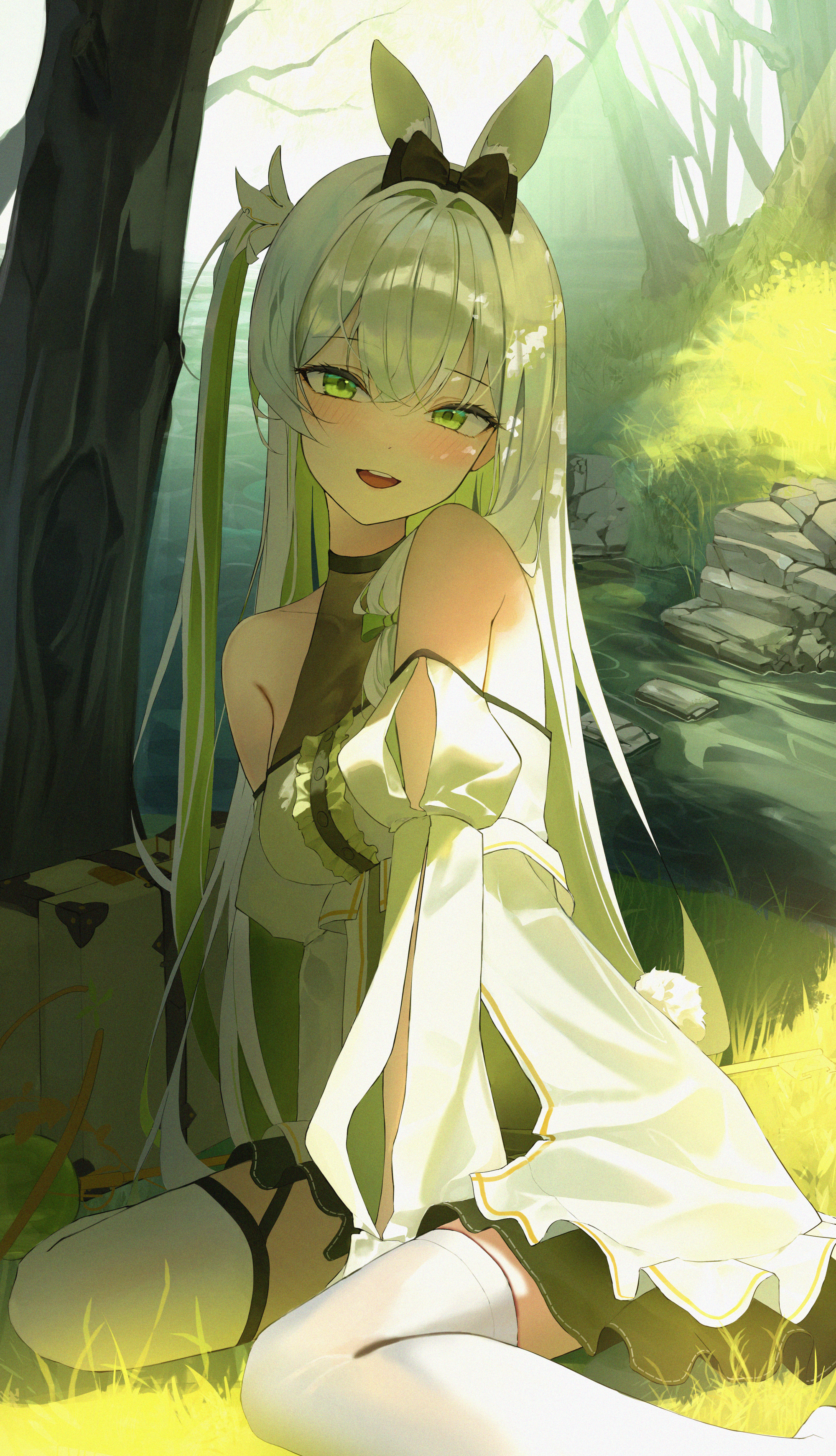 1girl absurdres animal_ears bare_shoulders black_bow blush bow commentary crossed_bangs dress green_eyes grey_hair hair_between_eyes hair_bow high_side_ponytail highres looking_at_viewer on_grass open_mouth original outdoors rabbit_ears rabbit_tail shiina_1001 sitting sleeve_slit solo suitcase symbol-only_commentary tail thighhighs tree wariza water white_dress white_thighhighs zettai_ryouiki