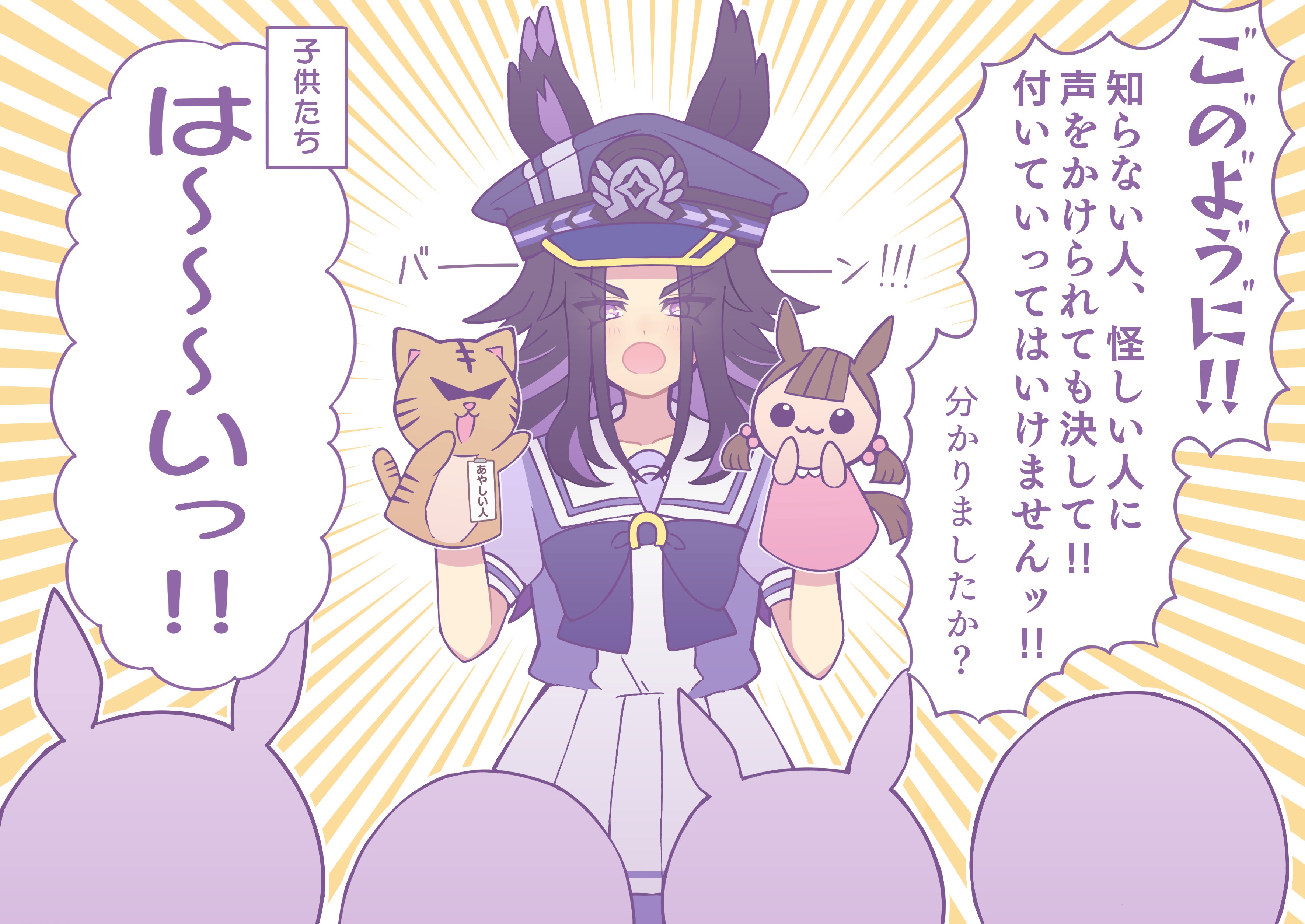 1girl 4others absurdres animal_ears black_hair blush bow bowtie commentary_request ears_through_headwear fenomeno_(umamusume) flipped_hair hand_puppet hat highres horse_ears horse_girl horseshoe_hat_ornament horseshoe_ornament long_hair multicolored_hair multiple_others open_mouth peaked_cap pleated_skirt puffy_short_sleeves puffy_sleeves puppet purple_bow purple_bowtie purple_eyes purple_hair purple_shirt sailor_collar sailor_shirt school_uniform shirt short_sleeves skirt speech_bubble tracen_school_uniform translation_request umamusume w3n6e white_sailor_collar white_skirt