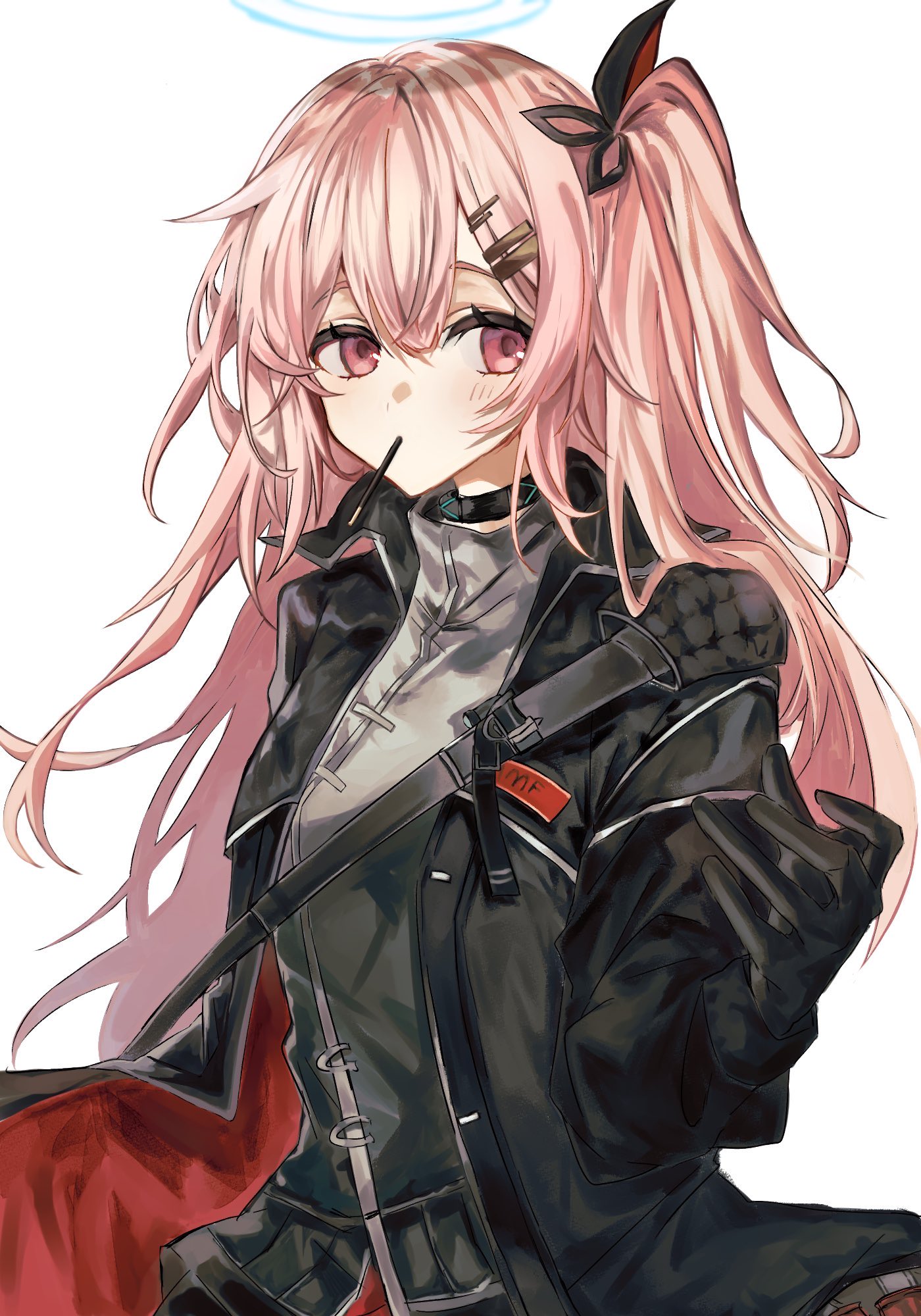 1girl ambriel_(arknights) arknights black_gloves black_jacket blue_halo commentary_request food food_in_mouth gloves hair_between_eyes hair_ornament hairclip halo hand_up highres infection_monitor_(arknights) jacket long_hair long_sleeves nktg one_side_up open_clothes open_jacket pink_eyes pink_hair pocky pocky_in_mouth simple_background solo strap upper_body white_background