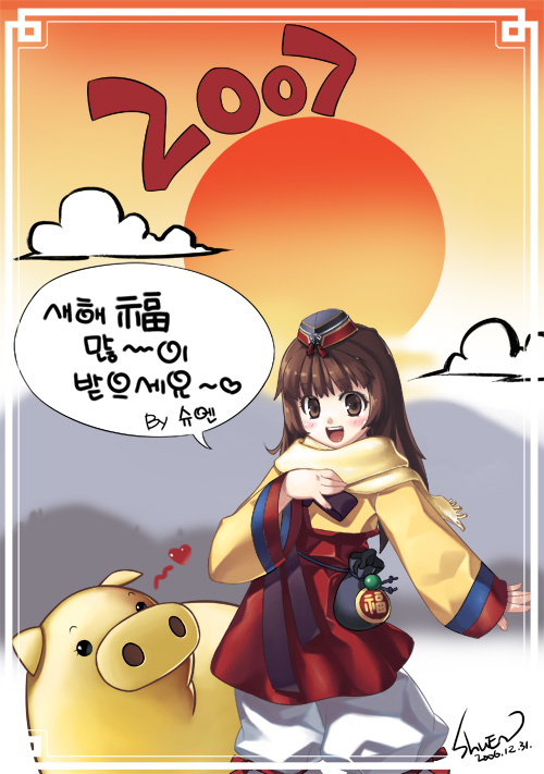 1girl 2006 2007 :d artist_name bad_id bag baji black_bag black_eyes black_hat blush bokjumeoni border brown_eyes brown_hair chima_(clothes) chinese_zodiac cloud commentary_request dated drawstring drawstring_bag eyelashes gold_fur gradient_sky hanbok hand_on_own_hip hat heart high-waist_skirt jeogori_(clothes) korean_clothes korean_commentary looking_at_viewer medium_skirt new_year nostrils open_mouth original pants pig pillbox_hat purple_ribbon red_skirt red_trim ribbon scarf shuen simple_background skirt sky smile solid_eyes speech_bubble standing sun teeth tongue translation_request upper_teeth_only waist_bag white_border white_pants wide_sleeves year_of_the_pig yellow_jeogori yellow_scarf yellow_sky yellow_sleeves