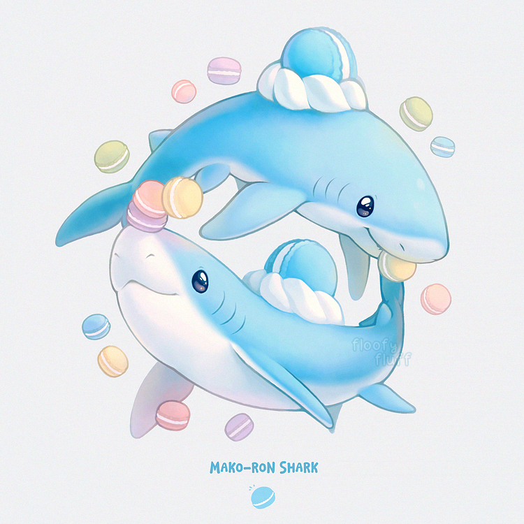 animal commentary english_commentary english_text food food-themed_creature food_in_mouth full_body ida_(floofyfluff) macaron no_humans original pun shark