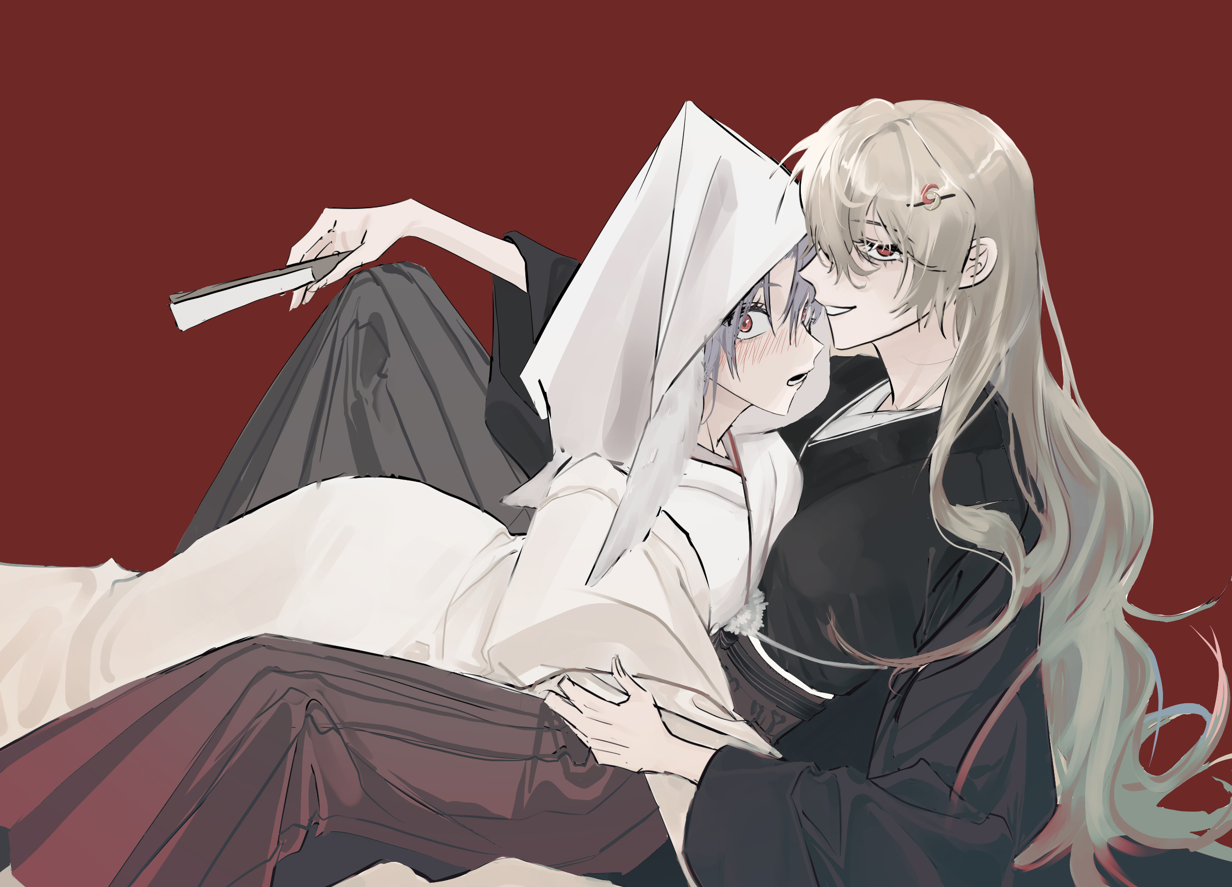 2girls alternate_costume animal_ears black_kimono black_vs_white blonde_hair blush bride commentary_request empty_eyes feet_out_of_frame female_focus fingernails hair_between_eyes hakama hakama_pants half-closed_eyes hand_fan hand_up highres holding holding_fan japanese_clothes junko_(touhou) kimono korean_commentary long_hair long_sleeves looking_at_viewer lying lying_on_person multiple_girls no_headwear on_stomach open_mouth pants purple_hair rabbit_ears rabbit_girl red_background red_eyes red_pants reisen_udongein_inaba simple_background sitting smile teeth touhou tt_orang uchikake veil wavy_hair white_kimono white_veil wide-eyed wide_sleeves wife_and_wife yuri