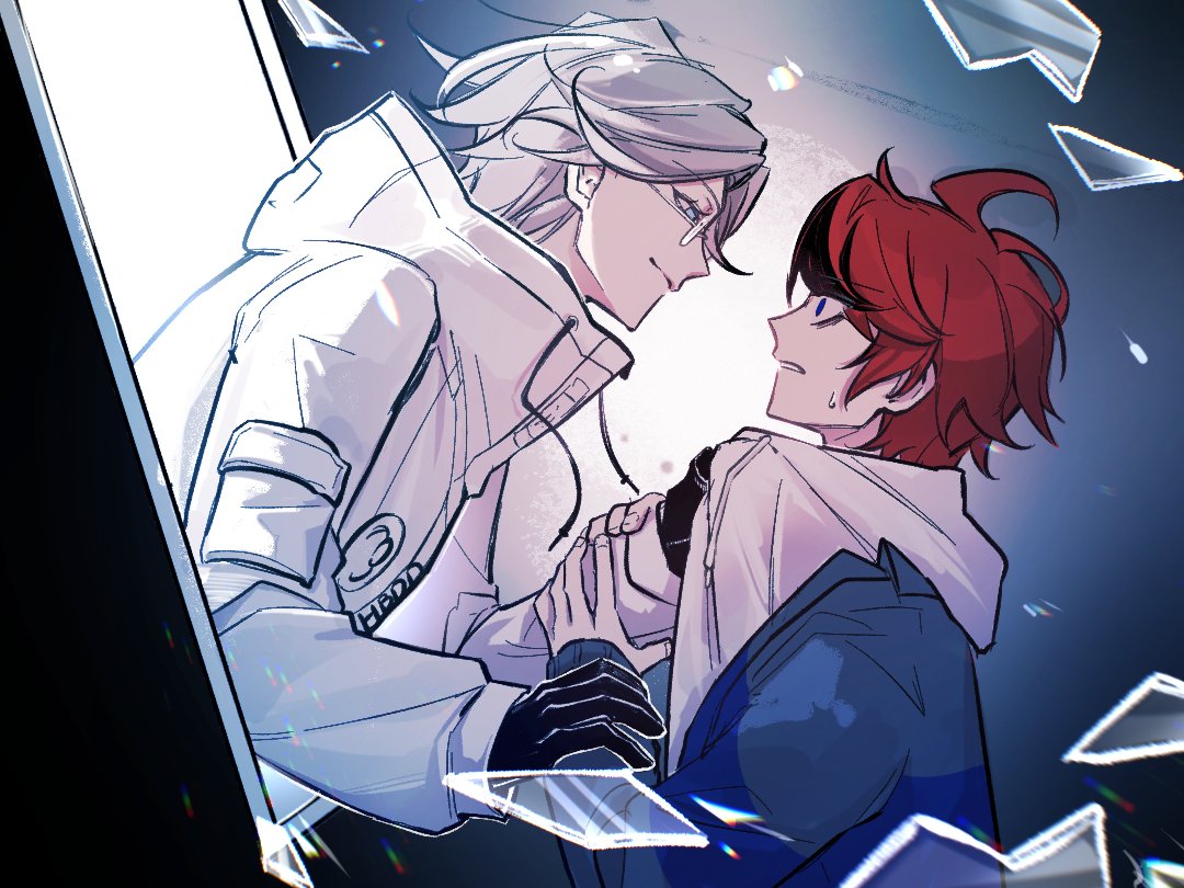 2boys ahoge aotsuki_eito black_gloves black_streaks blue_eyes blue_jacket chinese_commentary clothes_grab commentary_request drawstring glass_shards glasses gloves grabbing_another's_arm grey_hair grey_jacket hb12767814 hood hoodie jacket jacket_over_hoodie male_focus multicolored_hair multicolored_jacket multiple_boys open_clothes open_jacket red_hair scared short_hair sleeve_pouch streaked_hair sumino_takumi sweatdrop the_hundred_line_-last_defense_academy- through_medium through_mirror two-tone_hair two-tone_jacket white_hoodie white_jacket wide-eyed