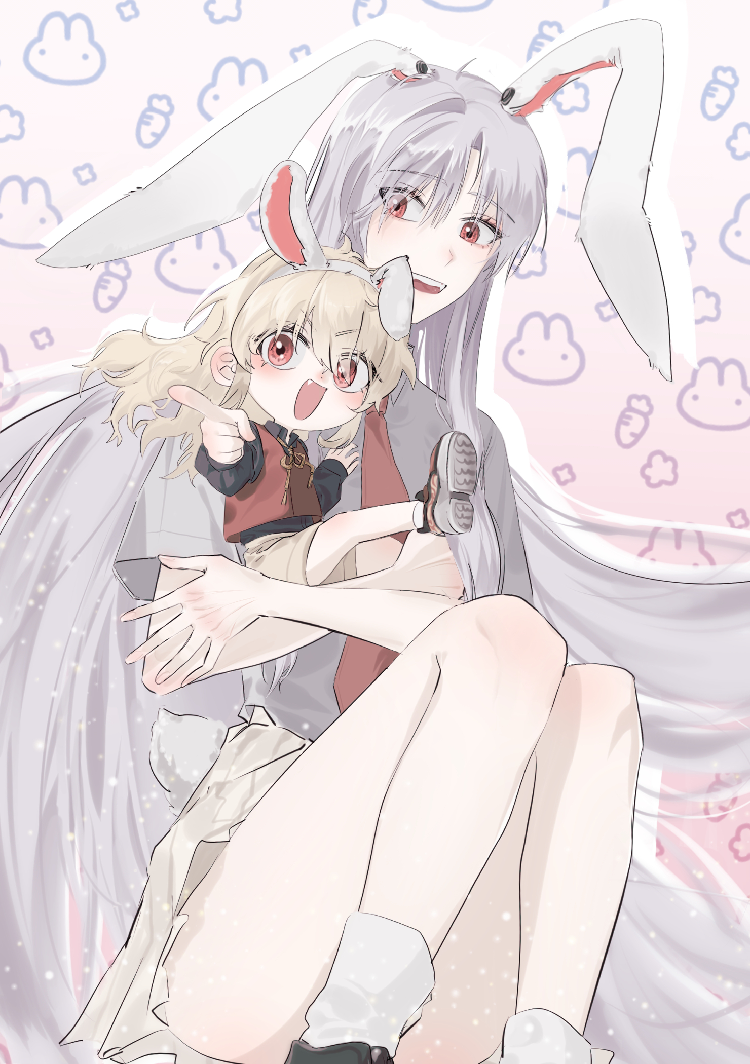 2girls aged_down alternate_costume animal_background animal_ear_hairband animal_ears black_shirt black_shoes blonde_hair blush breasts carrot_background carrying carrying_person child collared_shirt commentary_request crossed_arms fake_animal_ears fang floating_hair hair_between_eyes hairband hand_up highres index_finger_raised junko_(touhou) korean_commentary leg_up long_hair long_sleeves looking_at_another looking_at_viewer loose_socks medium_breasts miniskirt multiple_girls neck_ribbon necktie open_mouth orange_ribbon pink_background pink_skirt pleated_skirt puffy_long_sleeves puffy_sleeves purple_hair rabbit_ears rabbit_girl rabbit_tail red_eyes red_necktie red_vest reisen_udongein_inaba ribbon shirt shoes short_sleeves shorts sidelocks sitting skirt smile socks tail teeth tongue touhou tt_orang v-shaped_eyebrows very_long_hair vest white_hairband white_shirt white_socks yellow_shorts