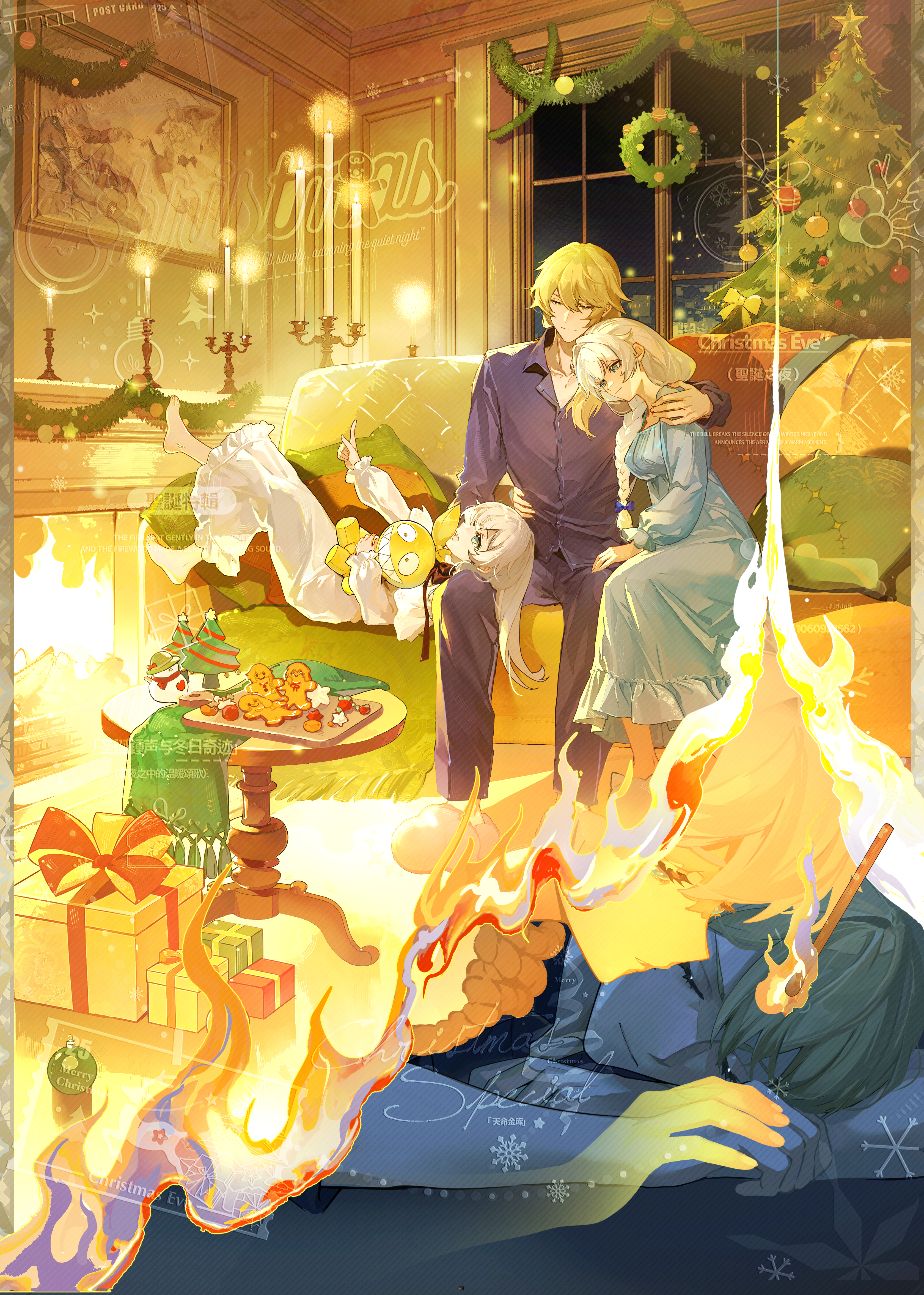 1boy 2girls absurdres alternate_universe blonde_hair blue_eyes candle character_doll chinese_commentary christmas christmas_tree closed_mouth commentary_request cookie couch couple doll fire food from_side green_eyes hair_between_eyes hand_on_another's_shoulder happy highres homu_(honkai_impact) honkai_(series) honkai_impact_3rd image_sample indoors kallen_kaslana light_smile lofter_sample long_hair long_sleeves looking_down looking_to_the_side looking_up lying lying_on_person multiple_girls nightgown on_back on_couch on_side open_mouth otto_apocalypse pajamas pants sample_watermark smile spoilers sweets theresa_apocalypse tree watermark white_hair xinjinjumin223048268090