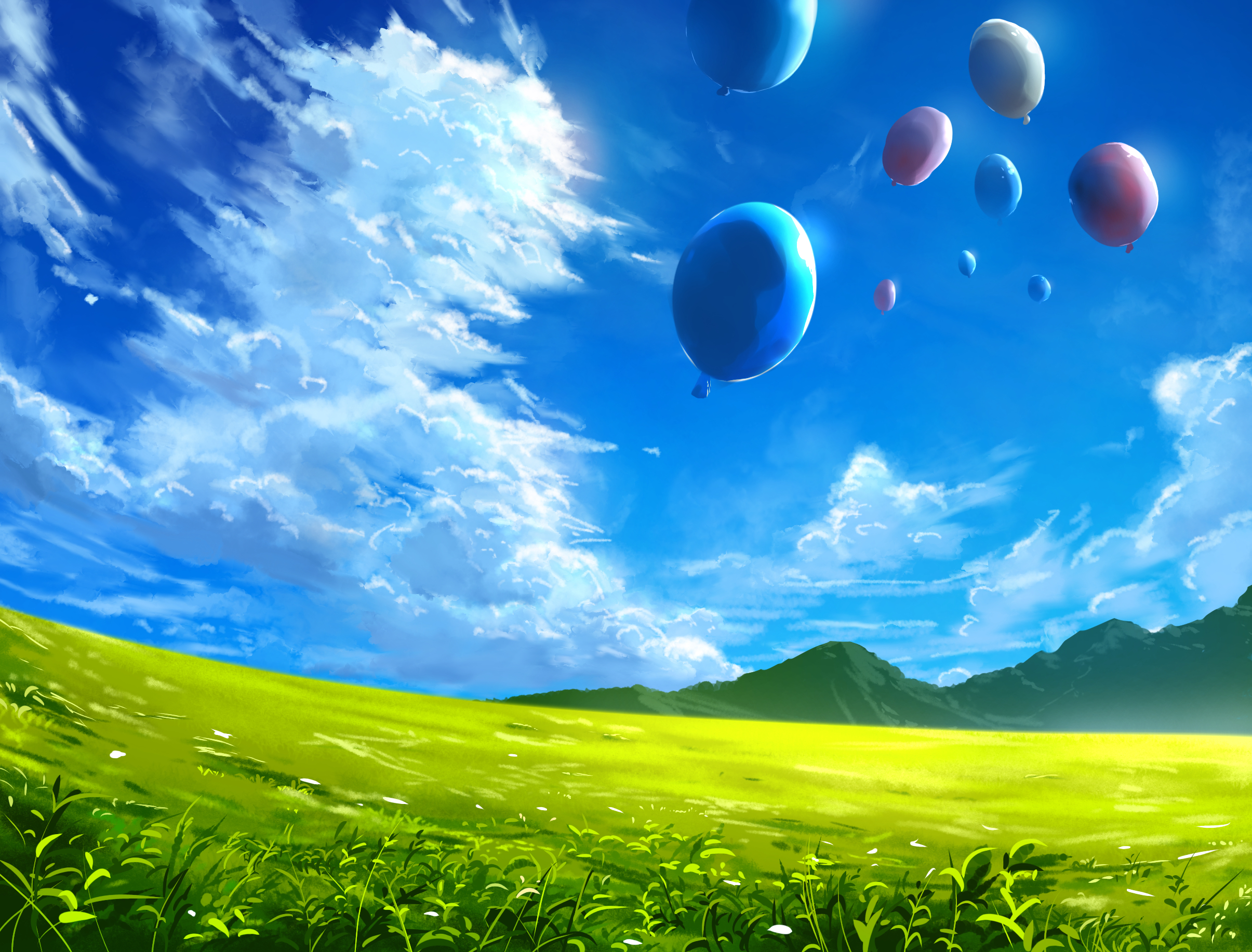 balloon blue_sky cloud commentary_request day highres hill horizon landscape meadow n_(nnn2927) no_humans original outdoors scenery sky