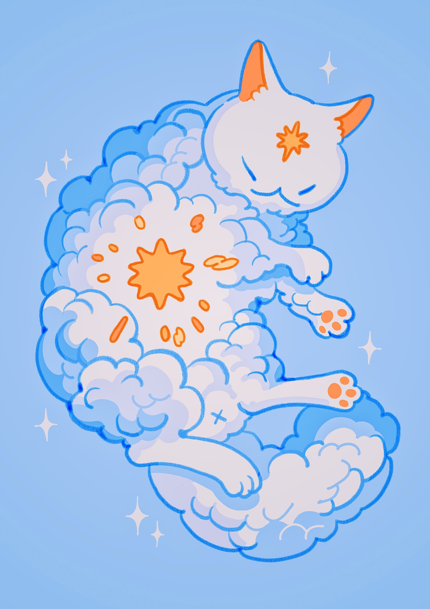 :< alt_text animal_focus blue_background blue_eyes blue_theme cat closed_eyes cloud cloudy_sky color_contrast colored_lineart commentary creature creature_focus english_commentary facial_mark forehead_mark full_body highres meyoco no_humans original simple_background sky sparkle star_(symbol) sun white_cat white_fur x_(symbol)