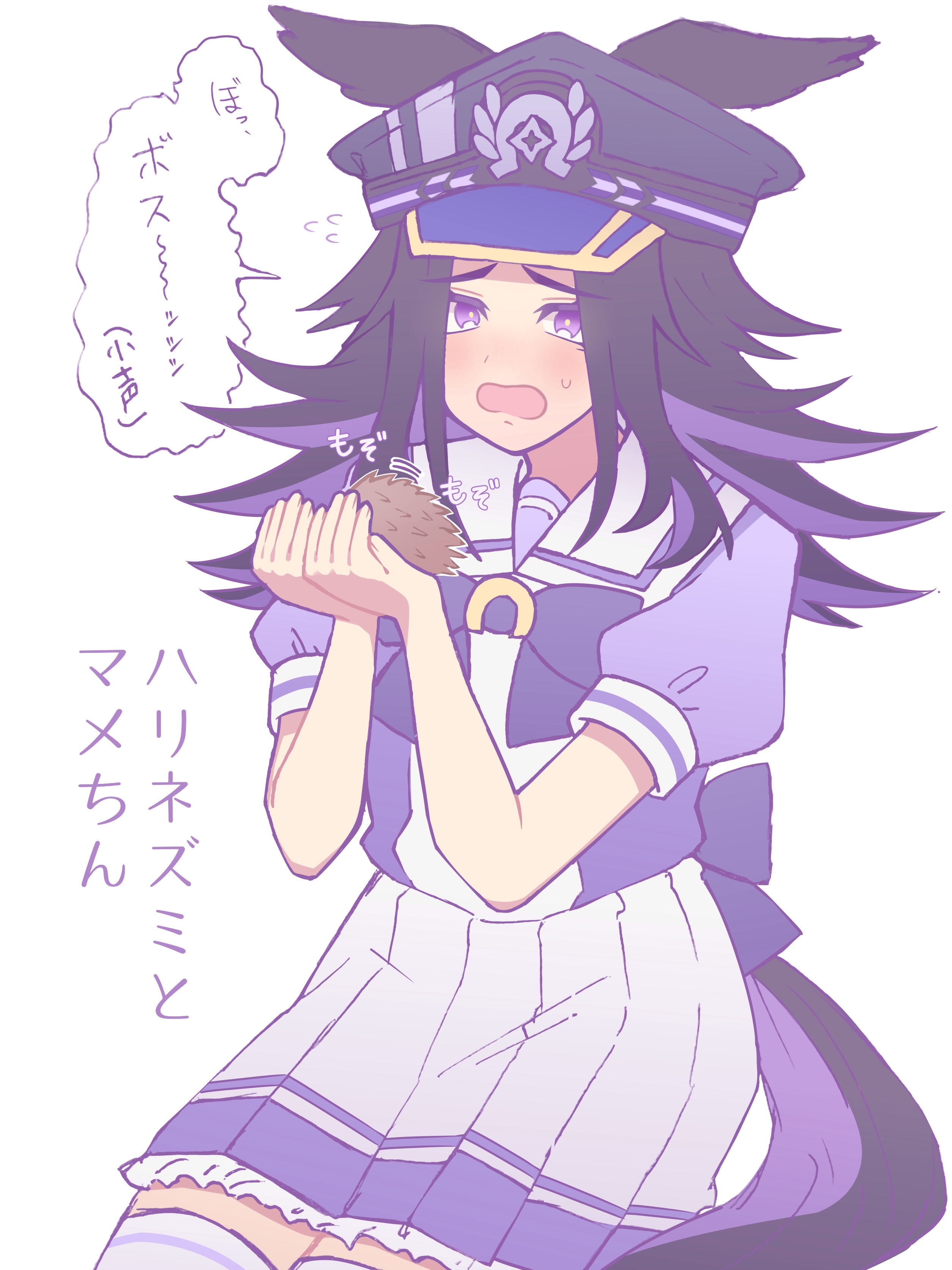 1girl absurdres animal_ears black_hair blush bow bowtie commentary_request ears_through_headwear fenomeno_(umamusume) flipped_hair hat highres holding horse_ears horse_girl horse_tail horseshoe_hat_ornament horseshoe_ornament long_hair looking_at_viewer multicolored_hair open_mouth peaked_cap pleated_skirt puffy_short_sleeves puffy_sleeves purple_bow purple_bowtie purple_eyes purple_hair purple_shirt sailor_collar sailor_shirt school_uniform shirt short_sleeves skirt speech_bubble sweatdrop tail thighhighs tracen_school_uniform translation_request umamusume w3n6e white_sailor_collar white_skirt white_thighhighs