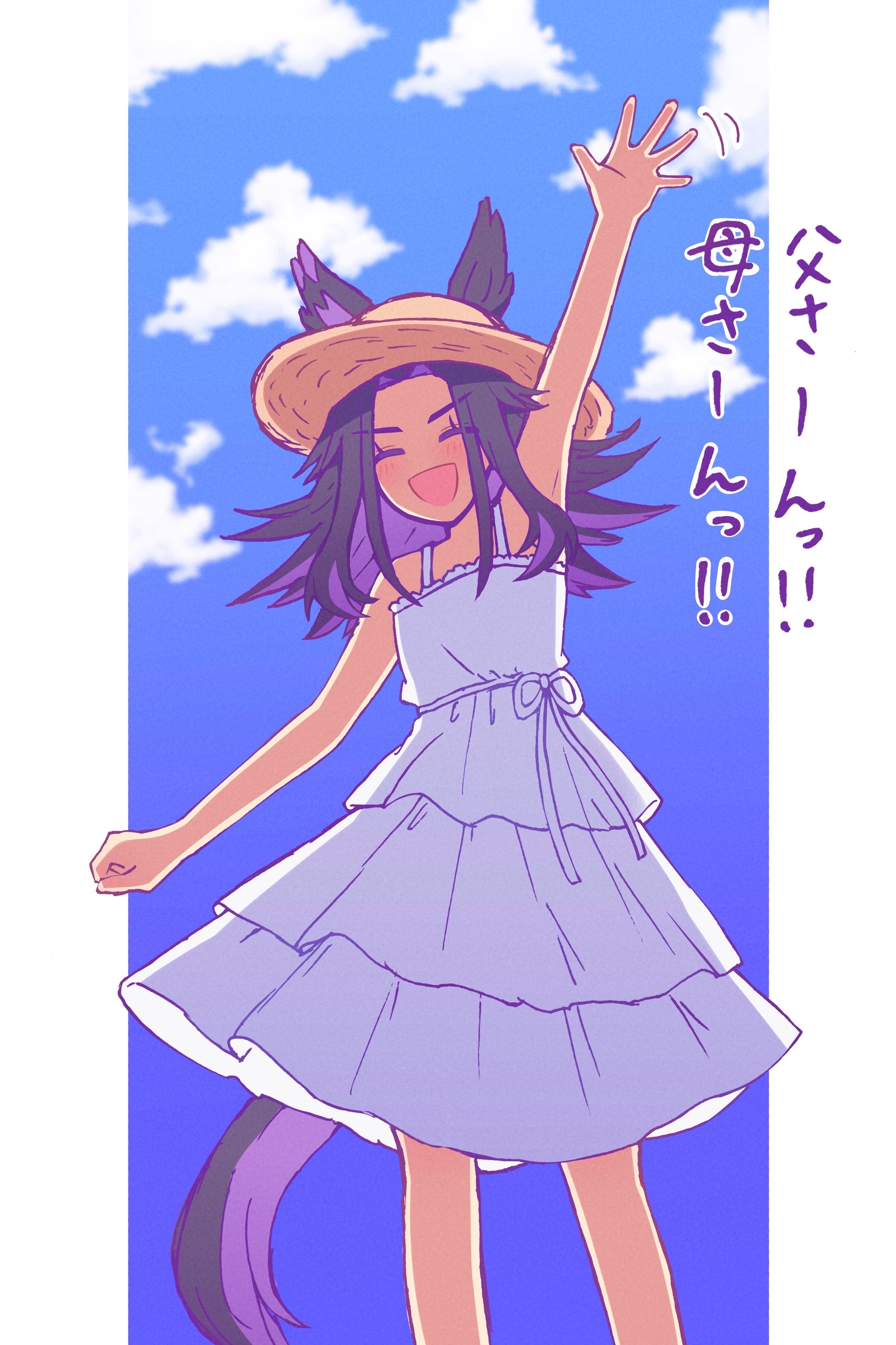 1girl absurdres animal_ears black_hair blush closed_eyes commentary_request dress ears_through_headwear facing_viewer fenomeno_(umamusume) hat highres horse_ears horse_girl horse_tail long_hair multicolored_hair open_mouth purple_hair sleeveless sleeveless_dress smile straw_hat sun_hat sundress tail umamusume w3n6e waving white_dress