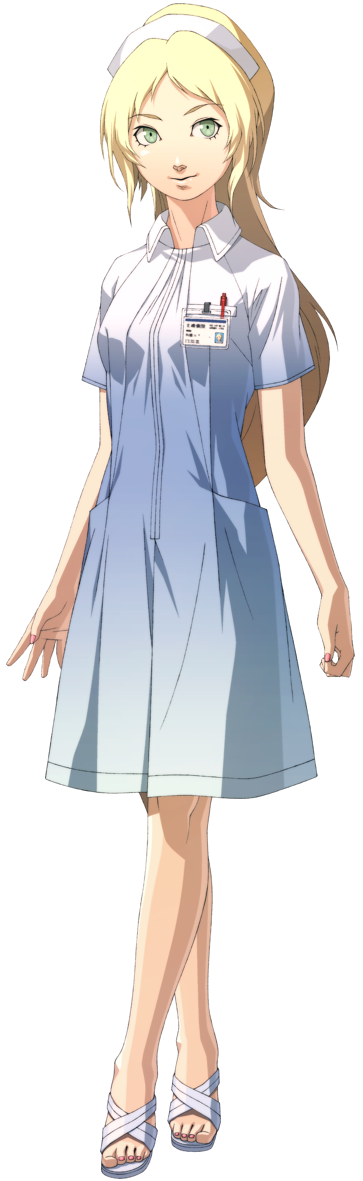 1girl absurdres blonde_hair chou_shittou_caduceus crossed_legs doi_masayuki dress full_body green_eyes hat highres long_hair nurse nurse_cap official_art ponytail sandals simple_background smile solo standing third-party_source toes tonegawa_anju transparent_background watson_cross