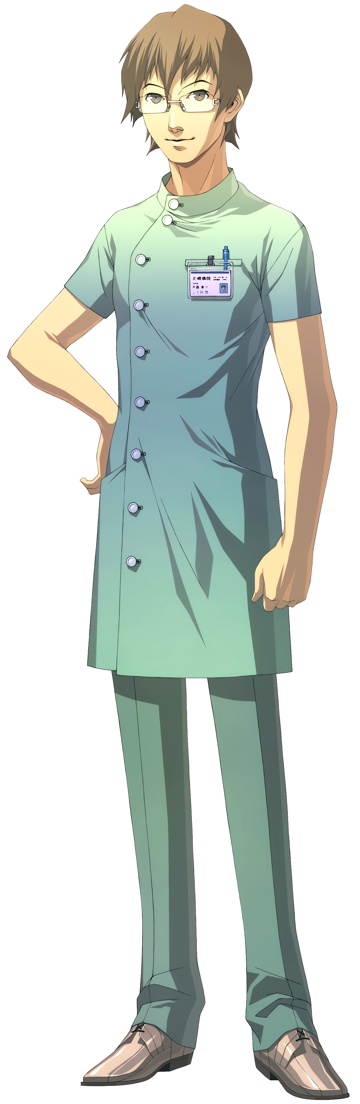 1boy absurdres brown_eyes brown_hair chou_shittou_caduceus doi_masayuki full_body glasses hand_on_own_hip highres id_card male_focus official_art simple_background smile solo standing third-party_source transparent_background tsukimori_kousuke