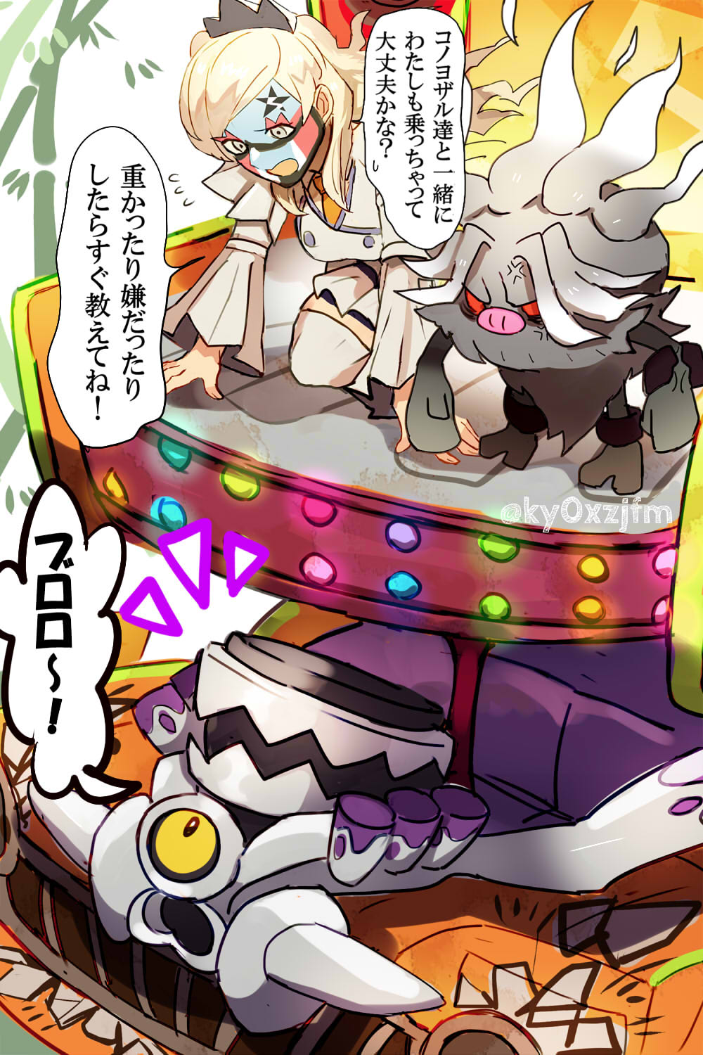 1girl anger_vein annihilape bamboo commentary_request eri_(pokemon) facepaint flying_sweatdrops grey_eyes highres kizami_(hetaisi) kneeling long_hair long_sleeves nintendo nostrils notice_lines one-eyed open_mouth pokemon pokemon_(creature) pokemon_sv revavroom speech_bubble team_star translation_request white_hair