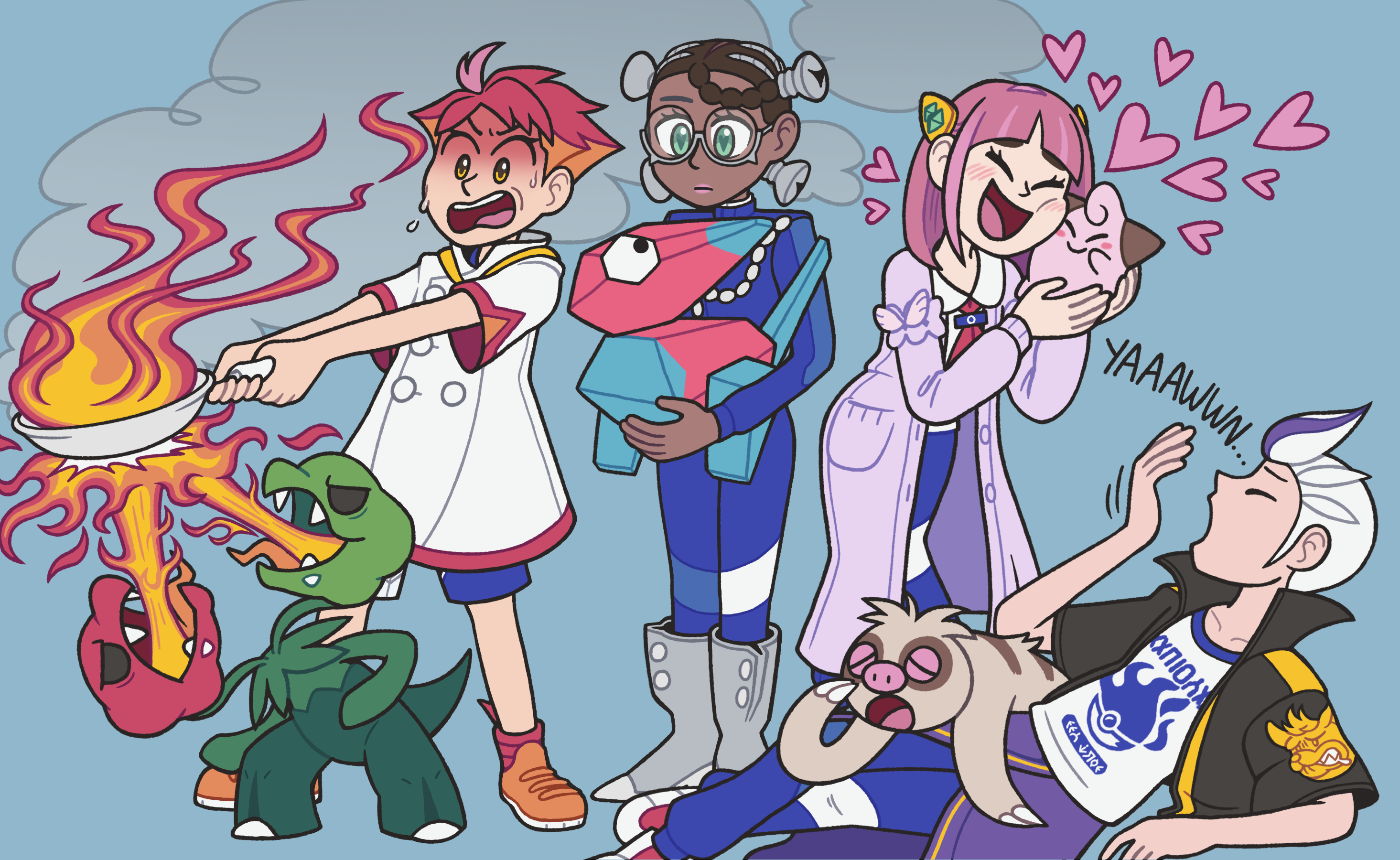 2boys 2girls ahoge amarys_(pokemon) black_jacket blue_background blue_pants blue_shirt blueberry_academy_school_uniform blunt_bangs blush boots breath_weapon breathing_fire brown_hair cardigan character_print cleffa closed_eyes closed_mouth clothes_around_waist collared_shirt commentary crispin_(pokemon) dark-skinned_female dark_skin english_commentary eyelashes fangs fire flat_color frying_pan gen_1_pokemon gen_2_pokemon gen_3_pokemon glasses green_eyes grey-framed_eyewear grey_boots grey_hair hair_ornament hairclip heart highres holding holding_frying_pan holding_pokemon jacket jewelry lacey_(pokemon) league_club_uniform long_sleeves lying maschiff motion_lines multicolored_hair multiple_boys multiple_girls multiple_heads necklace necktie nintendo nintooner no_sclera nostrils on_side on_stomach open_cardigan open_clothes open_jacket open_mouth orange_hair orange_shoes pants pink_hair pink_lips poke_ball_print pokemon pokemon_(creature) pokemon_sv porygon purple_cardigan purple_hair red_hair red_necktie red_shoes round_eyewear school_uniform scovillain shirt shoes short_hair short_sleeves shorts simple_background slakoth smile smoke standing streaked_hair sweat teeth two-tone_hair upper_teeth_only white_hair white_jacket white_shirt yawning