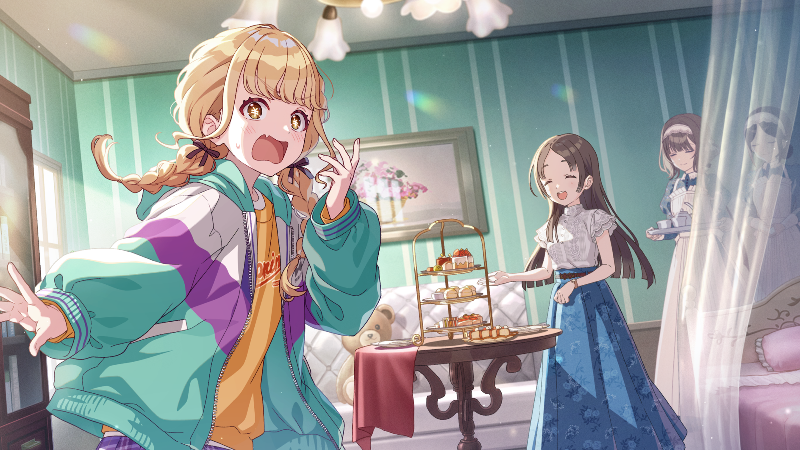 4girls apron beckoning bed bed_sheet bedroom black_hair blanket blonde_hair blue_dress blue_skirt blunt_ends blush book bookshelf braid breasts brown_hair buttons cake ceiling chandelier closed_eyes clothes_writing collared_dress couch cup curled_fingers curtains dress facing_another fang fingernails flat_chest floral_print floral_print_skirt food fujita_kotone furrowed_brow gakuen_idolmaster game_cg green_jacket hair_bun hair_ribbon hair_tie hairband hand_up hanging_light high-waist_skirt highres hiwatari_kanae holding holding_tray hood hood_down hooded_jacket idolmaster indoors jacket juliet_sleeves kuramoto_china lens_flare light_rays long_hair long_skirt long_sleeves looking_at_viewer looking_to_the_side low-tied_long_hair low_twin_braids maid maid_apron multicolored_jacket multiple_girls official_art open_clothes open_jacket open_mouth own_hands_together painting_(object) parted_bangs picture_frame pillow plaid_clothes plaid_skirt plate pleated_apron print_skirt puffy_sleeves purple_jacket purple_ribbon purple_skirt ribbon round_table see-through_curtains shirt shirt_tucked_in short_hair short_sleeves sidelocks single_hair_bun skin_fang skirt sleeve_cuffs small_breasts smile standing stuffed_animal stuffed_toy sunbeam sunlight surprised sweatdrop symbol-shaped_pupils table tablecloth teacup teapot teddy_bear teeth third-party_source tiered_tray translated tray turning_head twin_braids upper_teeth_only v-shaped_eyebrows wallpaper_(object) watch white_apron white_hairband white_jacket white_shirt window wristwatch yellow_eyes yellow_shirt yen_sign zipper