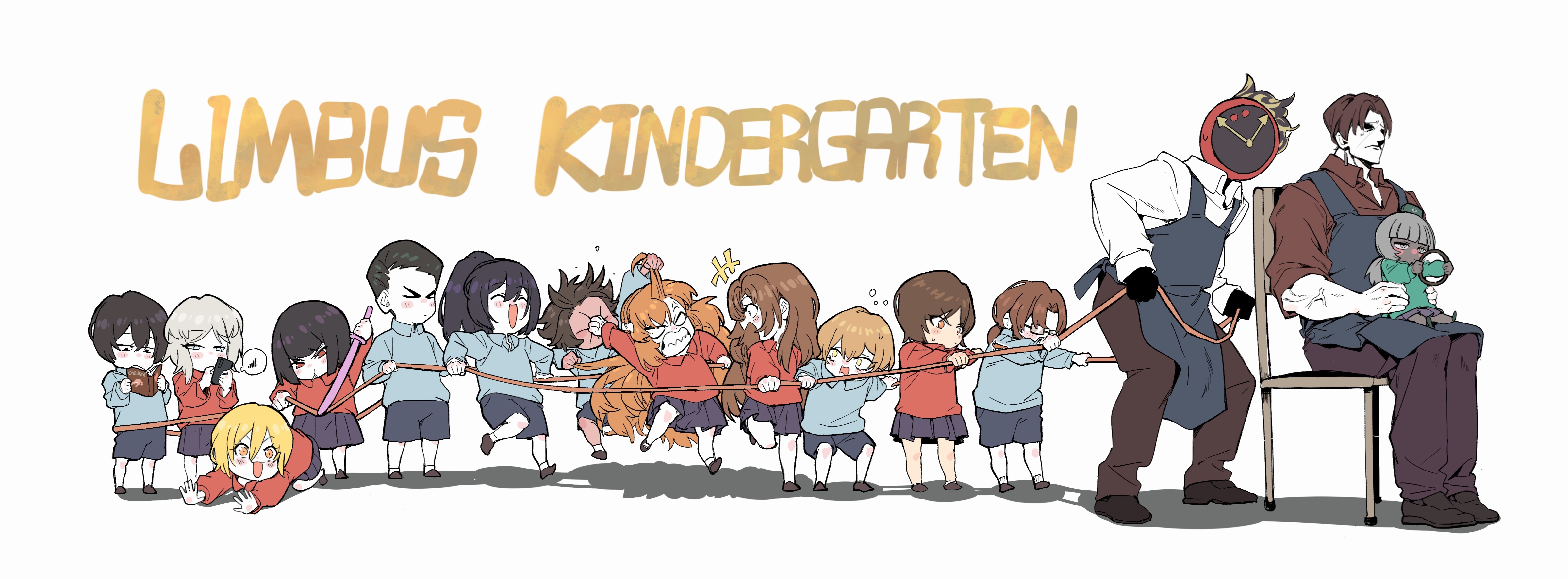 1other 6+boys 6+girls absurdres apron black_eyes black_hair black_shoes blonde_hair blue_apron blue_eyes blue_shirt book brown_eyes brown_hair brown_pants brown_shirt chair charon_(project_moon) collared_shirt commentary dante_(limbus_company) don_quixote_(project_moon) english_commentary english_text faust_(project_moon) gregor_(project_moon) heathcliff_(project_moon) highres holding holding_book hong_lu_(project_moon) ishmael_(project_moon) kindergarten_uniform limbus_company long_hair mayic11 meursault_(project_moon) multiple_boys multiple_girls orange_hair outis_(project_moon) pants project_moon punching red_shirt rodion_(project_moon) ryoshu_(project_moon) shirt shoes sidelocks simple_background sinclair_(project_moon) sitting vergilius_(project_moon) very_long_hair white_background white_hair yellow_eyes yi_sang_(project_moon)