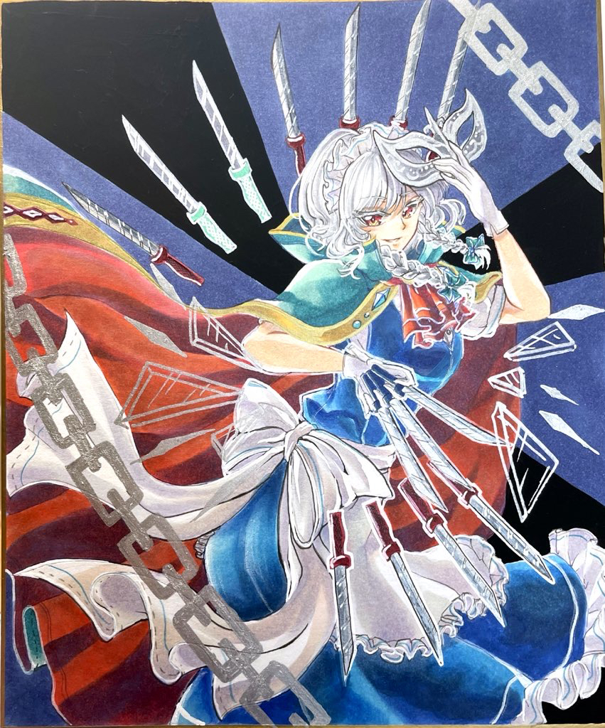 1girl apron back_bow between_fingers blue_dress bow braid cape chain commentary_request dress eye_mask gloves green_bow green_cape grey_hair hair_bow holding holding_knife holding_mask izayoi_sakuya knife knives_between_fingers maid maid_headdress marker_(medium) mask mitsu~ open_mouth red_cape red_eyes shikishi smile solo touhou traditional_media twin_braids two-sided_cape two-sided_fabric waist_apron white_apron white_bow white_gloves