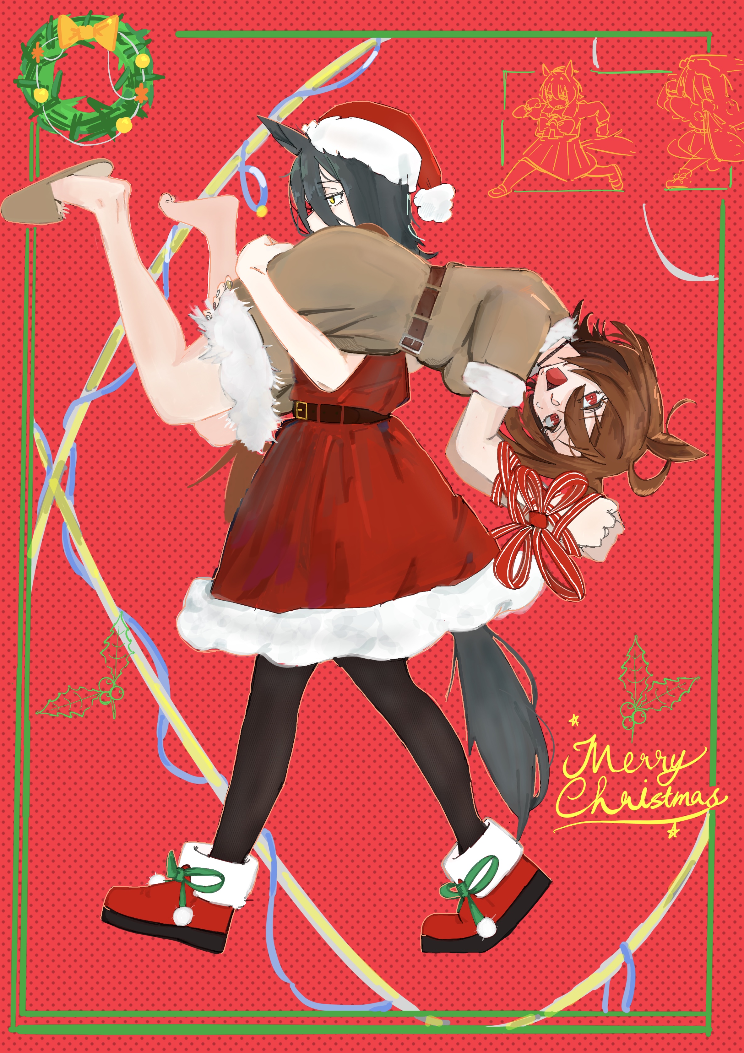2girls absurdres agnes_tachyon_(umamusume) animal_ears belt black_belt black_pantyhose blonde_hair bound bound_arms bound_wrists breasts brown_dress brown_hair carrying carrying_over_shoulder carrying_person christmas_wreath commentary_request dress fur-trimmed_headwear fur-trimmed_shoes fur_trim hair_between_eyes hat highres horse_ears horse_girl horse_tail long_bangs long_hair_between_eyes manhattan_cafe_(umamusume) medium_breasts medium_hair merry_christmas multiple_girls over_shoulder pantyhose pink_sandals red_dress red_eyes red_hat red_ribbon red_shoes ribbon sandals santa_costume santa_hat shoes short_hair short_sleeves sweatdrop tail umamusume unti_brbr wreath yellow_eyes