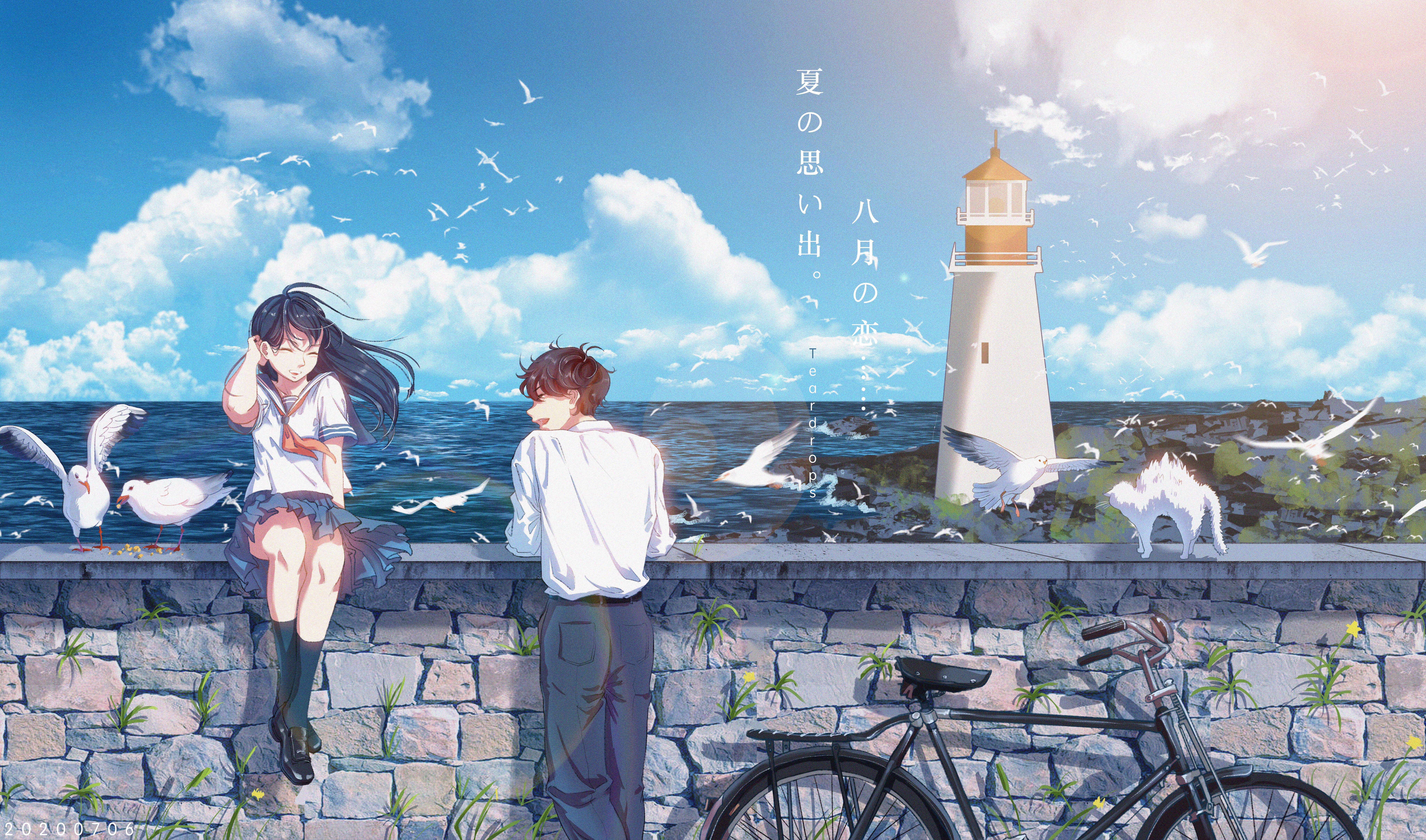 1boy 1girl absurdres artist_name belt bicycle bird black_belt black_hair black_shoes black_socks blue_pants blue_sailor_collar blue_skirt cat closed_eyes cloud commentary_request crossed_ankles day facing_another flock from_behind highres legs_together lighthouse loafers long_hair long_sleeves looking_at_another neckerchief ocean open_mouth original outdoors overgrown pants parted_lips pleated_skirt red_neckerchief rock sailor_collar school_uniform seagull shadow shirt shirt_tucked_in shoes short_hair short_sleeves sitting skirt sky smile socks standing stone_wall teardrops_(user_vgvd7733) tower translation_request turning_head white_cat white_shirt wide_shot