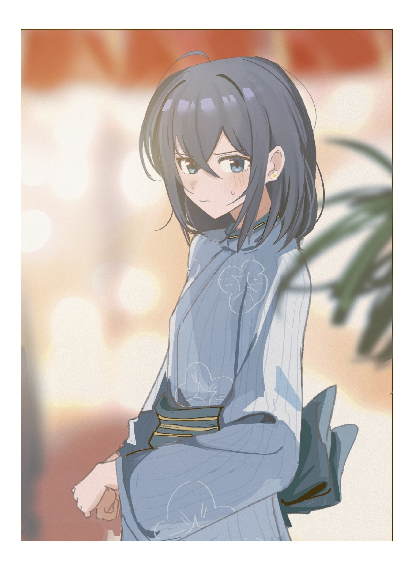 1girl blue_eyes blue_hair blue_kimono blue_sash blurry blurry_background blush border chinese_commentary closed_mouth commentary_request floral_print haidao_mao hair_between_eyes highres japanese_clothes kimono long_sleeves looking_at_viewer miyagi_shiori obi sash shuuniichido_classmate_wo_kau_hanashi solo sweatdrop white_border